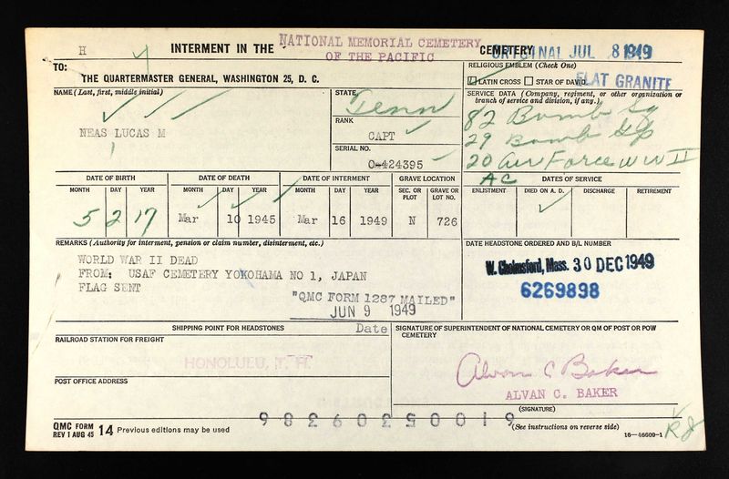 Captain Neas was initially buried at the USAF Cemetery Yokohama No. 1 in Japan.