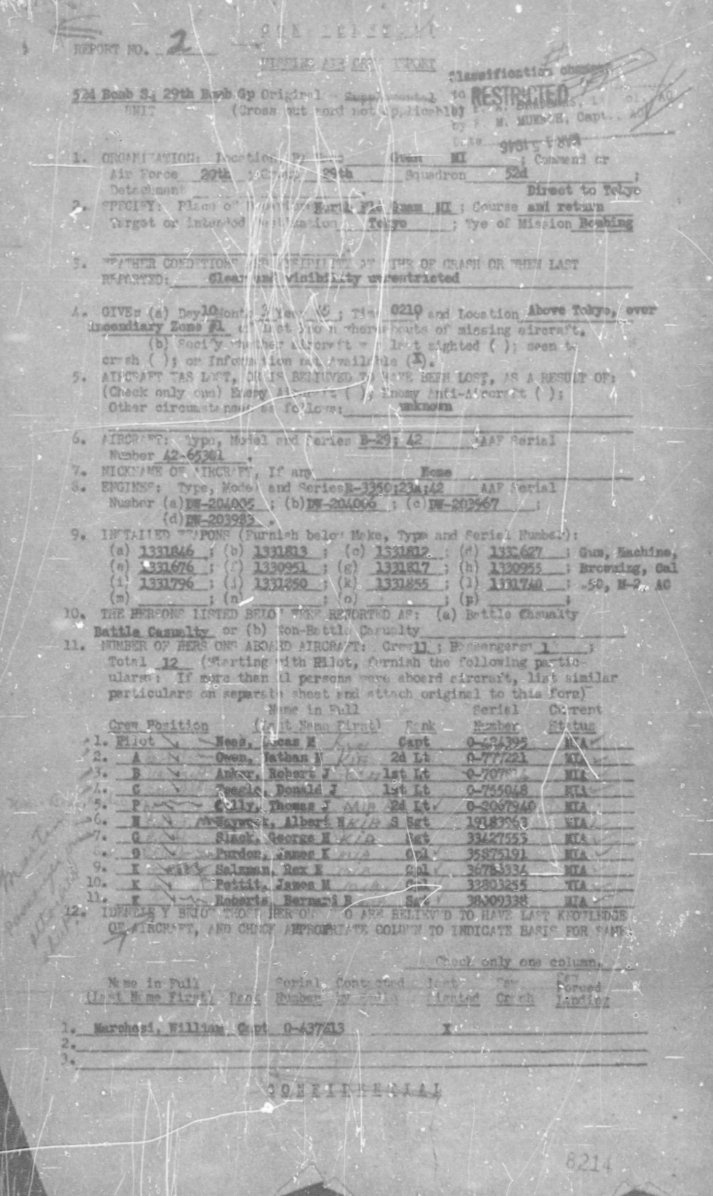 Plane lost during Incendiary Raid on Tokyo, Japan on Mission 37. Target Tokyo City area. Shot down by AA fire and crashed in an electric factory in Ogu-Cho, Arakawa-Ku, Tokyo.