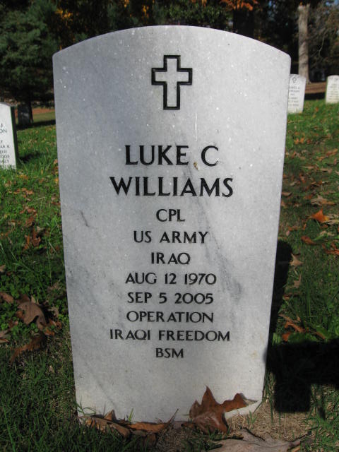 Cpl. Luke C. Williams of Knoxville, Tennessee worked at the Knoxville Kroger supermarket before enlisting. After working there for seven years, he enlisted in order better himself and try to provide a better life for his family. Store employees had recently sent him a care package with snacks and magazines on University of Tennessee football. It’s a sign of how well liked Luke was that people who shopped at the supermarket where he worked jammed phone lines to offer their condolences. Luke was hired at Kroger in 1989 and transferred to the Northshore location when the store opened in 1996. He enlisted in the military to give his family a better life. He saw it as an opportunity to better himself and as a chance to provide for them. Employees retired his locker, which remained unclaimed with his name tag still attached. He is survived by his wife, Teresa, who just returned from a tour of duty in Iraq, a 7-year-old daughter, and a son, 10. He was killed at age 35 in Baghdad when his vehicle accidentally rolled over into a ditch.