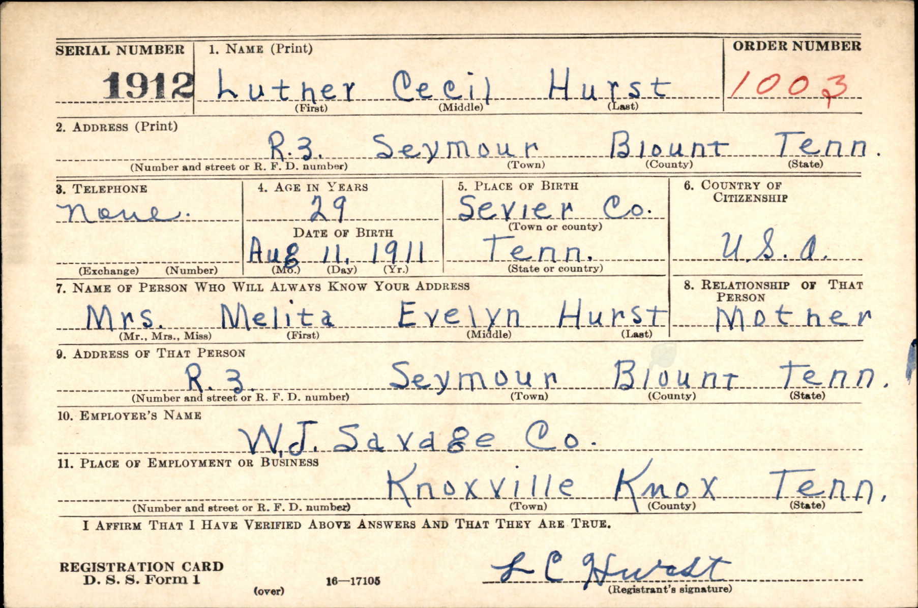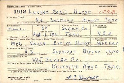 Private Luther Cecil Hurst was born in 1911. He was the son of John Wells Hurst and Maleta Evelyn Hammock and the brother of Taylor Hurst, Mayme Hurst, John Hurst, and Robert (Speedy) Hurst. Husband of Rosa E. Abbott. He lived in Sevier County in 1920, but moved to Blount County before enlisting for military service on August 4, 1943, in Fort Oglethorpe, Georgia. He was killed in action fighting for his country.
