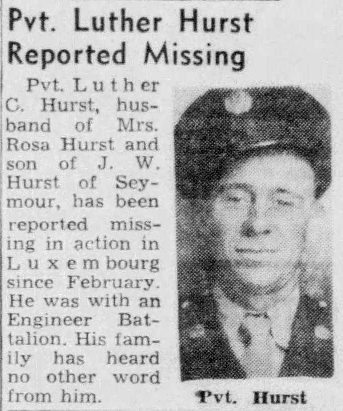 I am the grandson of Speedy Hurst who is the brother of Luther Hurst. Speedy’s real name is Robert Hurst. Speedy also served in WWII but survived. Luther was born in a small house located on Pickens Gap Rd in Blount County. When he was young he married a woman named Rose who left him while he was in Germany and they did not have children. My grandmother, Bonnie Hurst, Speedy’s wife stated that Luther was killed by a mortar shell trying to build a bridge across the Rhine or Tigris River. She used to carry a news article in her purse that revealed that the only thing they found was a boot and one dog tag. When Speedy asked the US Army where Luther was when he got killed they stated that is classified; he died as a hero and that is all that matters. His entire family tree can be seen at smokykin.com. I have been working with them for years on updating the Hurst tree.