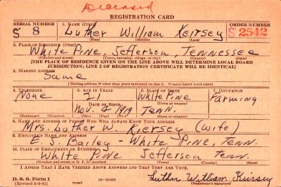 Luther William Keirsey was born at White Pine, Tennessee on 4 November 1919, the son of Hiram H. Keirsey and Rentie Beuta Sinard. He married Mary Ruth Kimbrough in 1939.