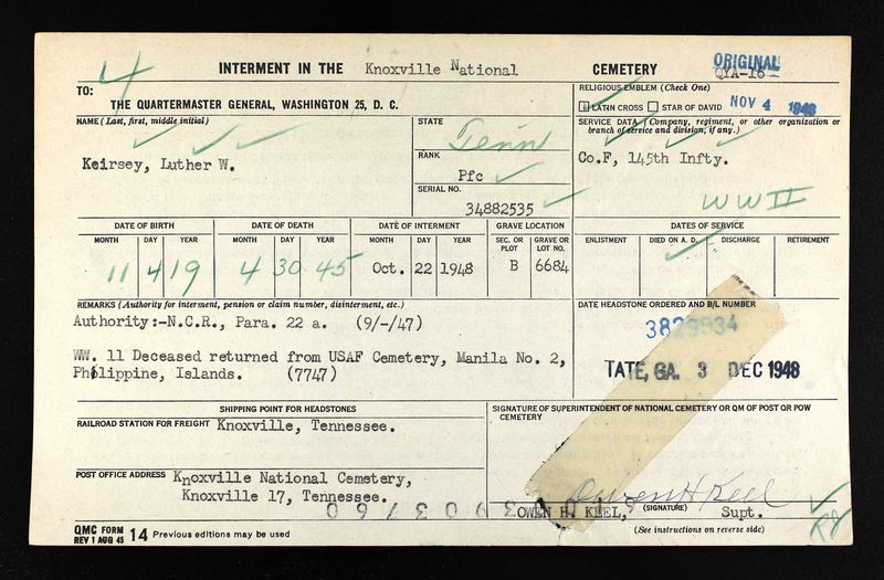 PFC Keirsey was killed in combat Northwest of Luzon, Philippine Islands. He was initially buried at the USAF Cemetery, Manila No. 2, Philippine Islands. He is buried at Knoxville National Cemetery, B, 6684.