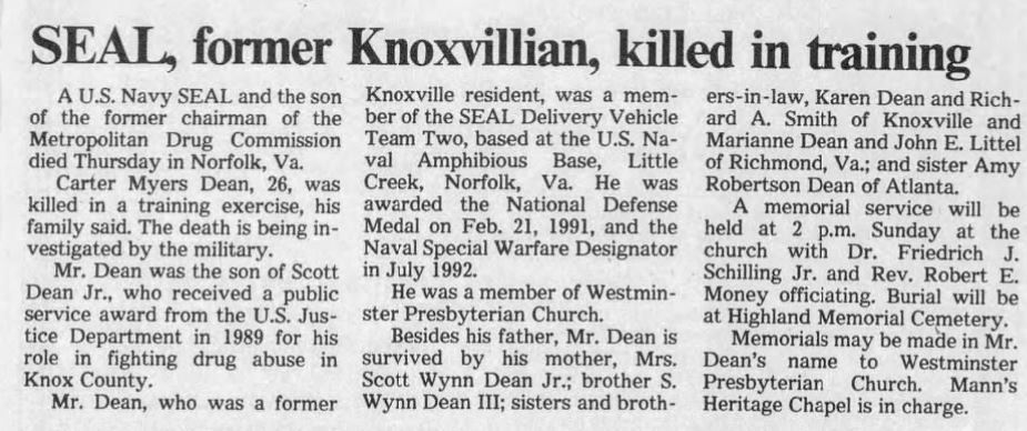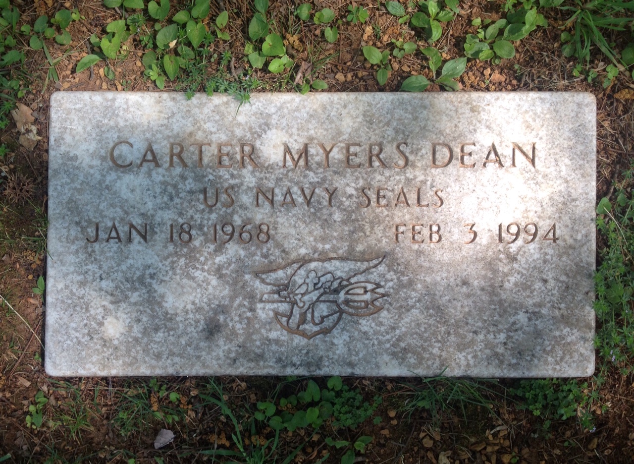 Carter Dean was born on January 18, 1968, in Tennessee. He enlisted in the U.S. Navy on April 16, 1990, and completed basic training at NTC Orlando, Florida, in June 1990. Dean next attended Gunner’s Mate training at NTC Great Lakes, Illinois, from July 1990 to February 1991, followed by Basic Underwater Demolition/SEAL training and SEAL Qualification training at NAB Coronado, California, from March 1991 to April 1992. Petty Officer Dean attended Basic Airborne training at Fort Benning, Georgia, in April and May 1992, and then attended SEAL Delivery Vehicle training from May to July 1992. His first assignment was as a SEAL Delivery Vehicle Operator/Navigator with SEAL Delivery Vehicle Team TWO (SDVT-2) at NAB Little Creek, Virginia, from August 1992 until he was killed in a training accident in Little Creek Harbor on February 3, 1994. Carter Dean was buried at the Highland Memorial Cemetery in Knoxville, Tennessee.