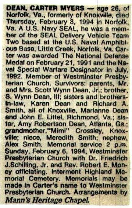 Carter Myers Dean died in Norfolk, Virginia, February 3, 1994, at the age of 26.