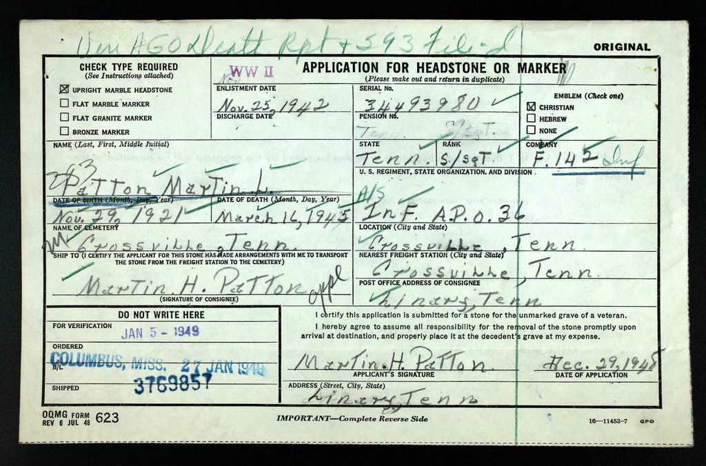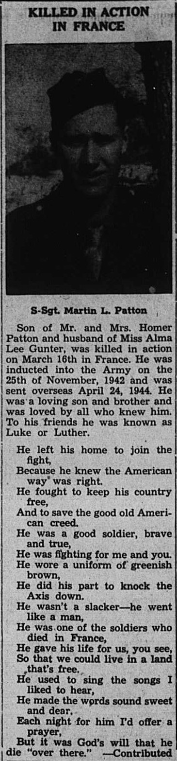S-Sgt Martin L. Patton, Son of Mr. and Mrs. Homer Patton and husband of Miss Alma Lee Gunter, was killed in action on March 16th in France. He was inducted into the Army on the 25th of November, 1942 and was sent overseas April 24, 1944. He was a loving son and brother and was loved by all who knew him. To his friends he was known as Luke or Luther.