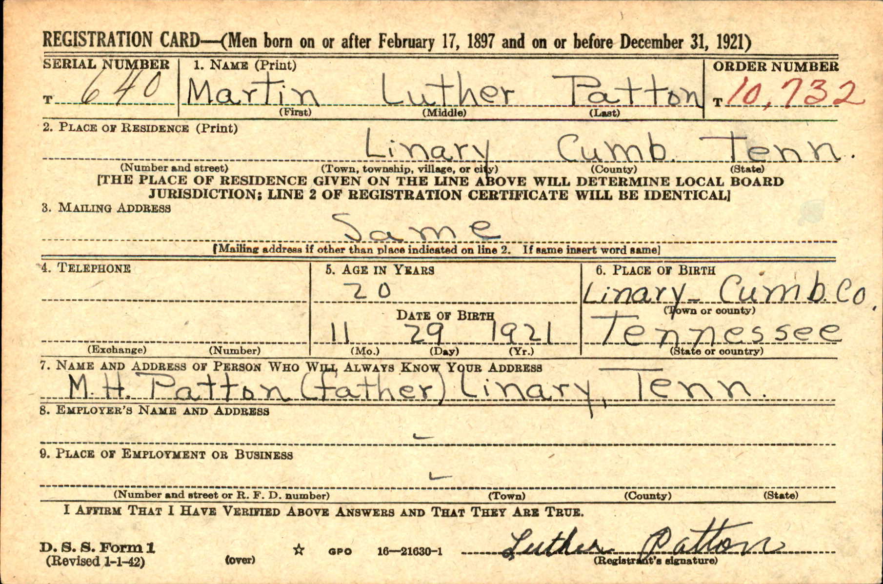 Martin Luther Patton was born 29 November 1921 to Martin Homer Patton and Lillian A. Wyatt.