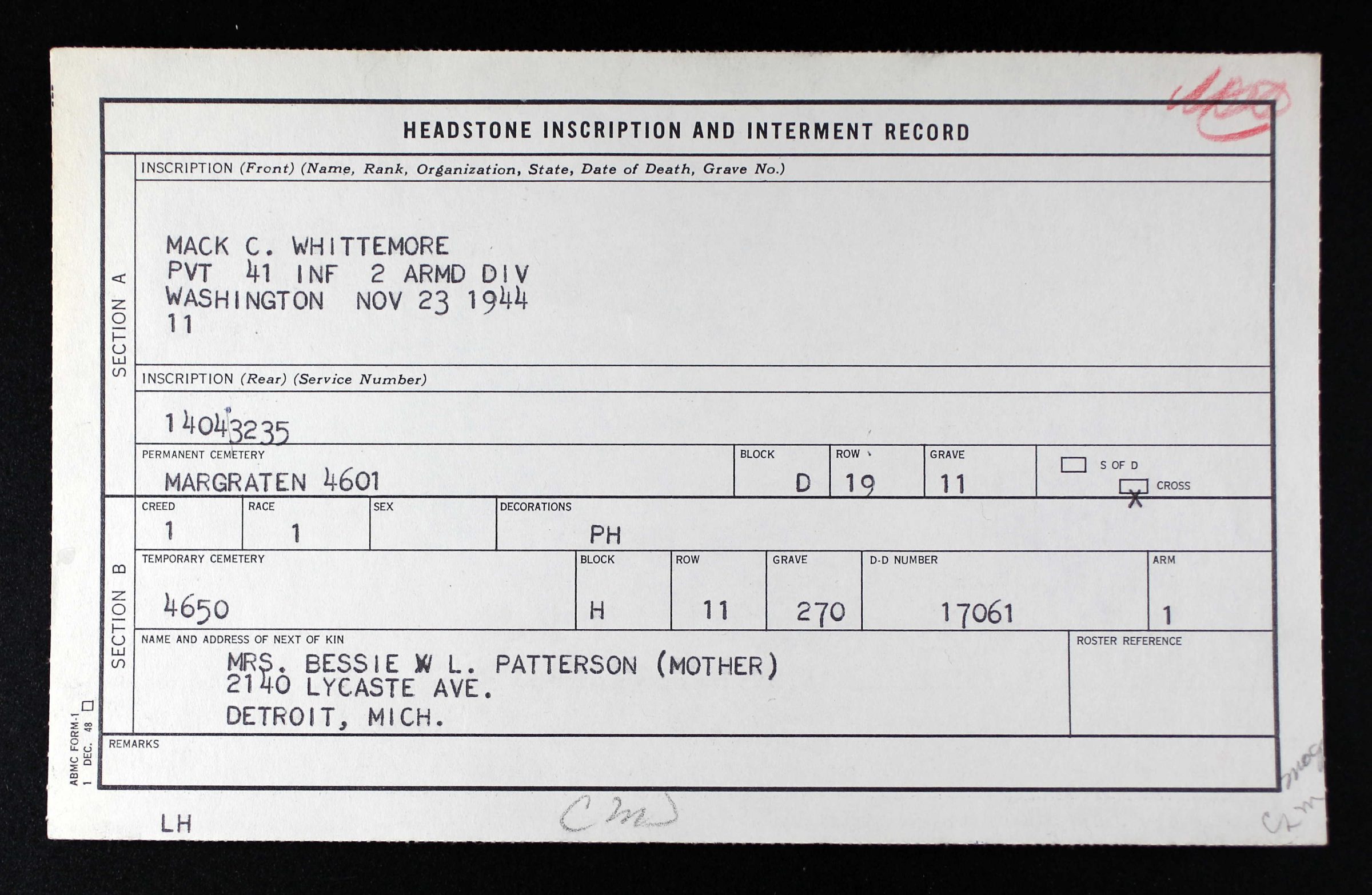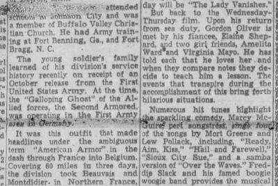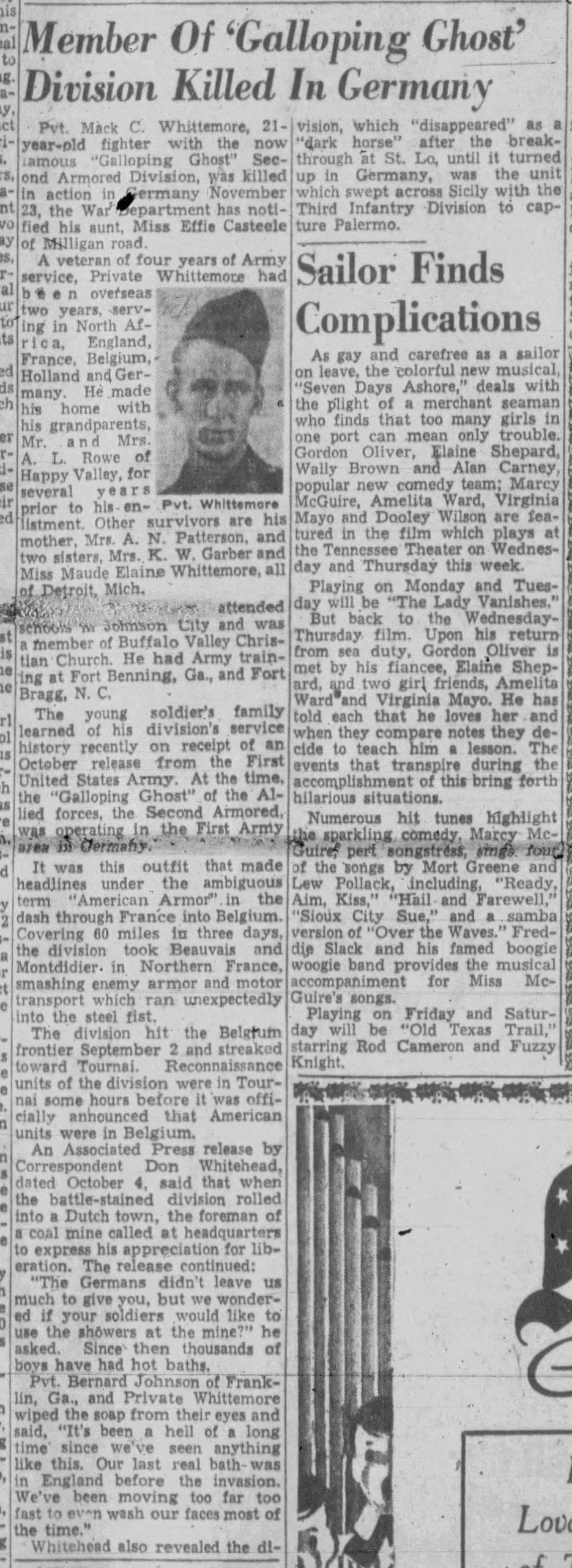 Pvt. Mack C. Whittemore, 21-year-old fighter with the now famous “Galloping Ghost” Second Armored Division, was killed in action in Germany, November 23, the War Department has notified his aunt, Miss Effie Casteele of Milligan road. A veteran of four yars of Army service, Private Whittemore had been overseas two years, serving in North Africa, England, France, Belgium, Holland and Germany. He made his home with his grandparents, Mr. and Mrs. A.L. Rowe of Happy Valley, for several years prior to his enlistment. Other survivors are his mother, Mrs. A.N. Patterson, and two sisters, Mrs. K.W. Garber and Miss Maude Elaine Whittemore, all of Detroit, Mich. Private Whittemore attended school in Johnson City and was a member of Buffalo Valley Christian Church. He had Army training at Fort Benning, Ga., and Fort Bragg, N.C.