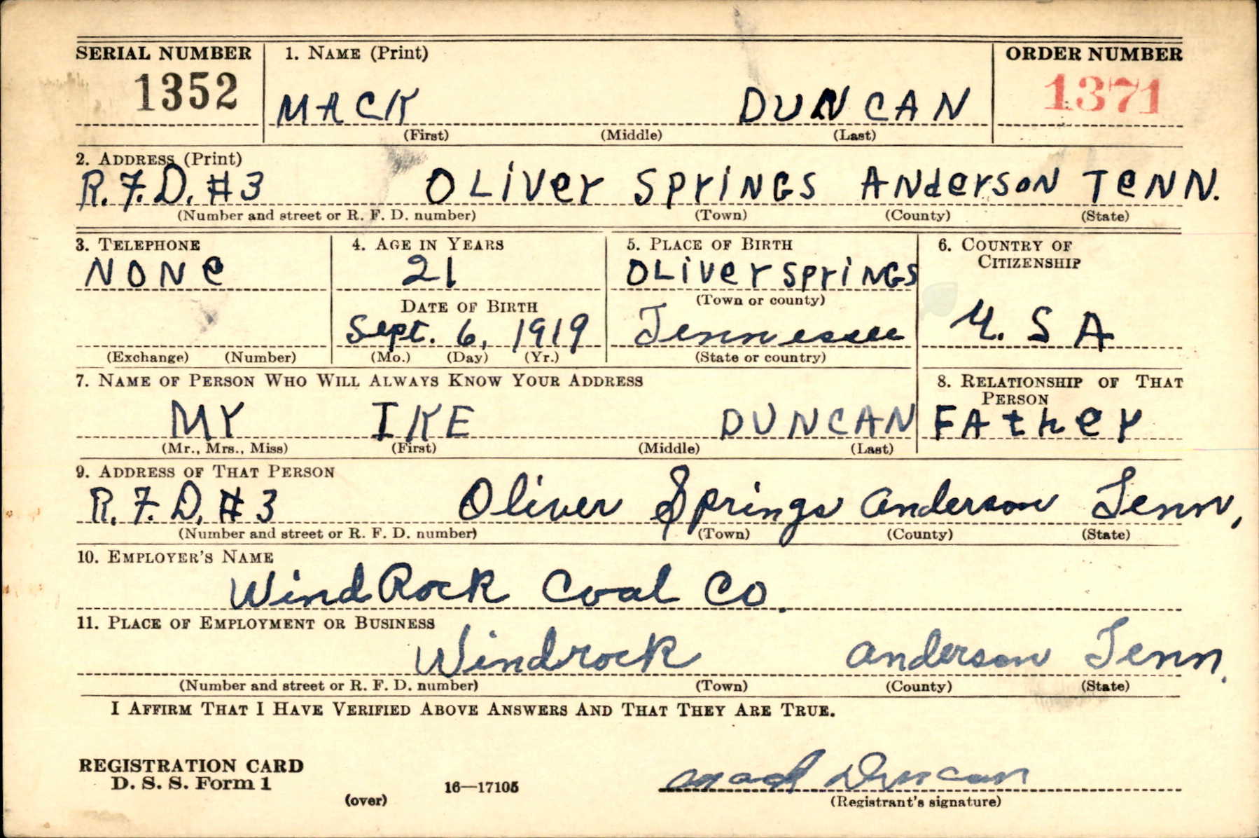 Mack Duncan was born in Oliver Springs, the son of Isaac Mackel Duncan and Sreldia Angeline Patterson.