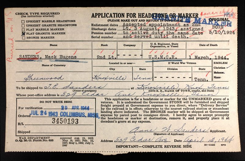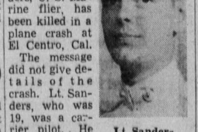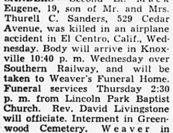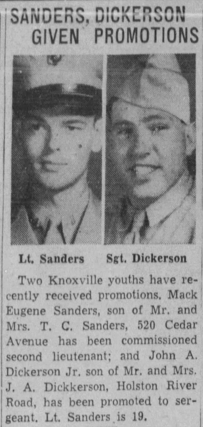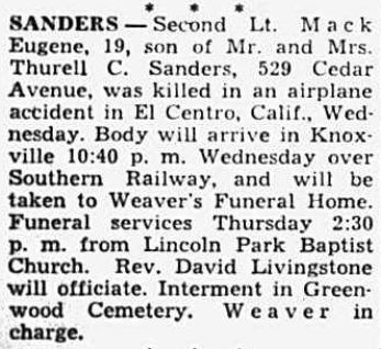 The War Department has notified Mr. and Mrs. Thurrell C. Sanders, 529 Cedar Avenue, Lincoln Park, that their son, Second Lt. Mack Eugene Sanders, U.S. Marine flier, has been killed in a plane crash at El Centro, Cal. The message did not give details of the crash. Lt. Sanders, who was 19, was a carrier pilot. He entered the service within a few weeks after graduating from Knoxville High School and was sworn in July 5, 1942. He took training at Clarksville, Tenn., Athens, Ga., and Pensacola, Fla. He was home on leave last November. Lt. Sanders’ father is chief clerk at the Southern Railway offices on South Gay Street. In addition to the parents he leaves three brothers, Thurrell Clark Sanders Jr., Charles Sanders and A.L. Sanders and a sister, Miss Martha Sanders, all of Knoxville.