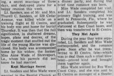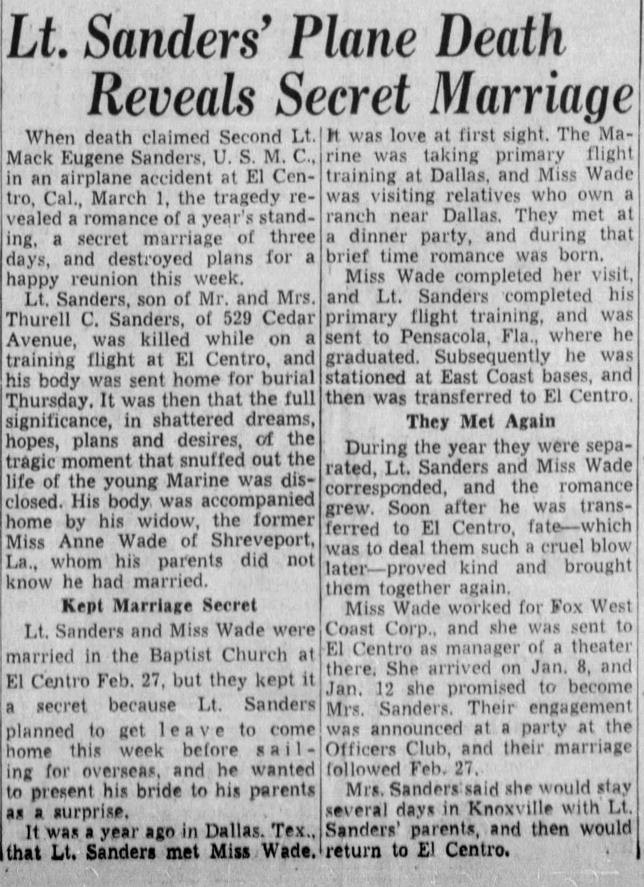 He married Anna Wade in the Baptist Church at El Centro, Texas on February 27, 1944, three days before he was killed. They kept it a secret because Lt. Sanders planned to get leave to come home before sailing for overseas, and he wanted to present his bride to his parents as a surprise. It was a year ago in Dallas, Texas, that Lt. Sanders met Miss Wade. It was love at first sight. The Marine was taking primary flight training at Dallas, and Miss Wade was visiting relatives who own a ranch near Dallas. They met at a dinner party, and during that brief time romance was born. Miss Wade completed her visit, and Lt. Sander completed his primary flight training, and was sent to Pensacola, Fa., where he graduated. Subsequently he was stationed at East Coast bases, and then was transferred to El Centro. During the year they were separated, Lt. Sanders and Miss Wade corresponded, and the romance grew. Soon after he was transferred to El Centro, fate – which was to deal them such a cruel blow later – proved kind and brought them together again. Miss Wade worked for Fox West Coast Corp. and she was sent to El Centro as manager of a theater there. She arrived on Jan. 8, and Jan. 12 she promised to become Mrs. Sanders. Their engagement was announced at a party at the Officers Club, and their marriage followed Feb. 27.