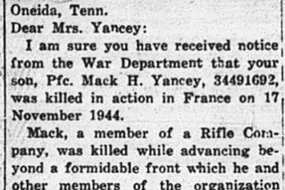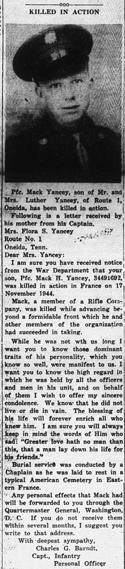 Pfc. Mack Yancey, son of Mr. and Mrs. Luther Yancey of Route 1, Oneida has been killed in action. Following is a letter received by his mother from his Captain.