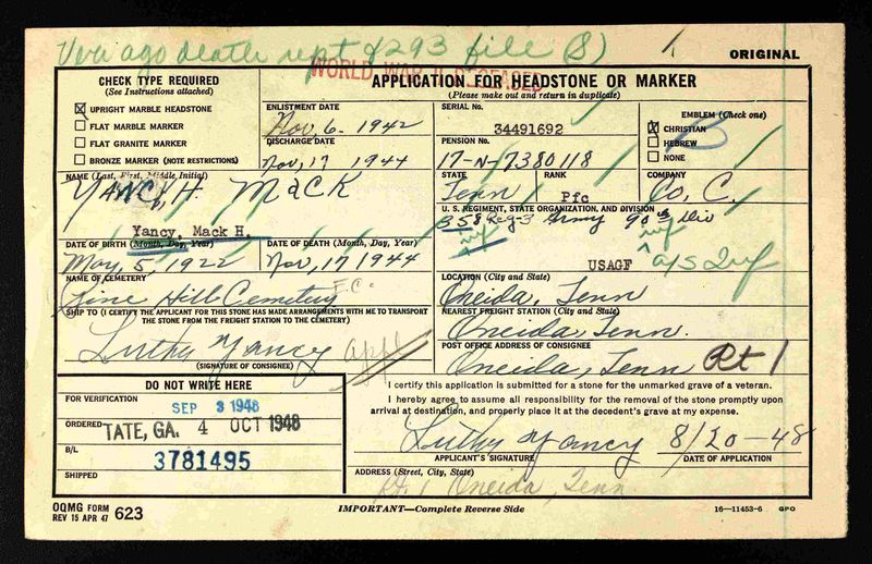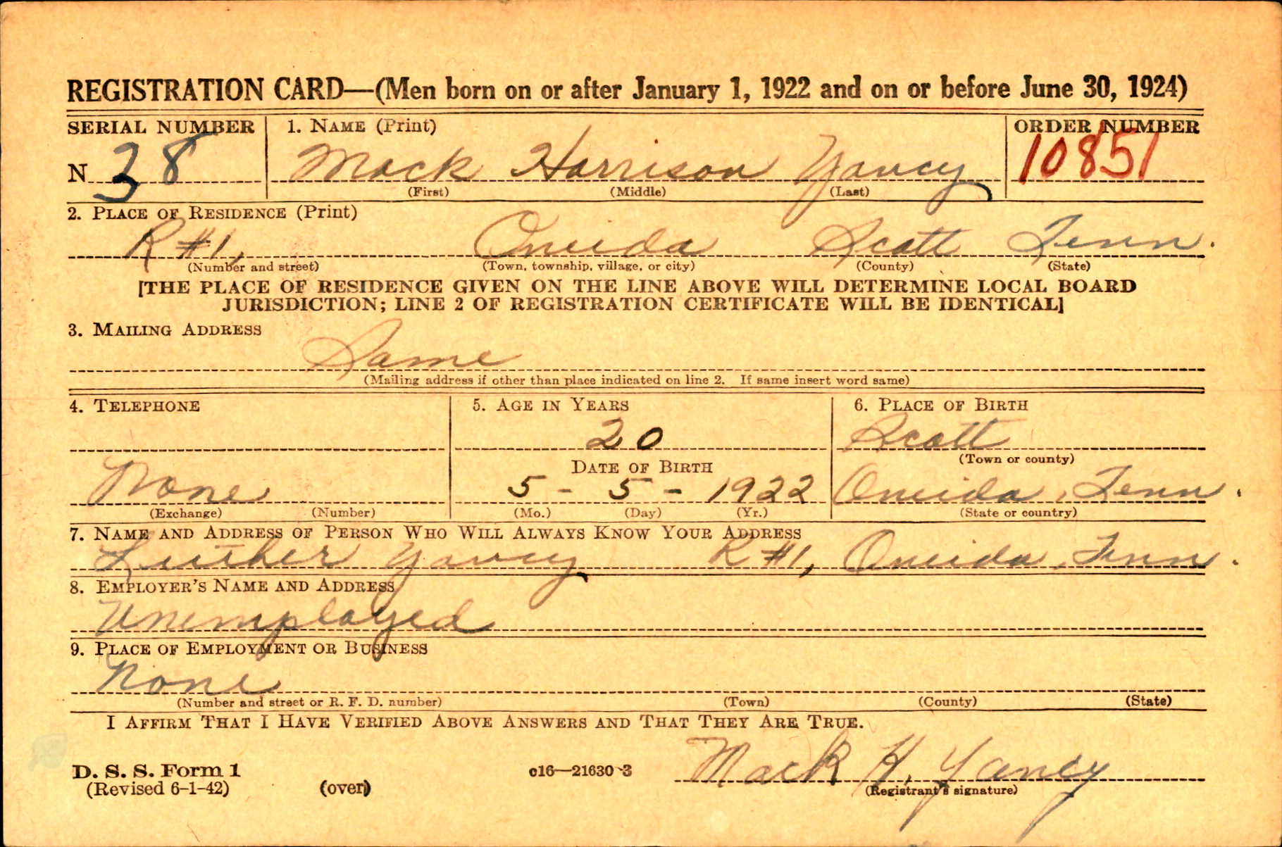 Mack Harrison Yancy was born in Oneida, Tennessee, the son of Luther Yancey and Flora Stanley. He joined the US Army on November 7, 1942 at Fort Oglethorpe, Georgia. According to his enlistment, he was a semi-skilled miner and mining-machine operator. He had one year of high school and was not married.