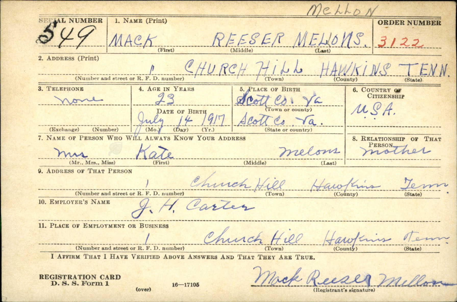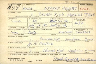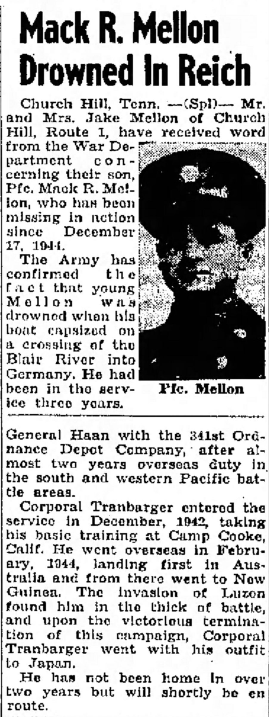 Church Hill, Tenn. – Mr. and Mrs. Jake Mellon of Church Hill, Route 1, have received word from the War Department concerning their son, PFC Mack R. Mellon, who has been missing in action since December 17, 1944.