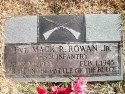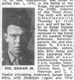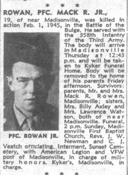 Mr. and Mrs. Mack Rowan, Sr. have been notified that the body of their son is en route home from overseas. Pvt. Rowan, 19, was killed in action on Feb. 1, 1945, in the Battle of the Bulge in Germany. He served with the 358th Infantry, Third Army.