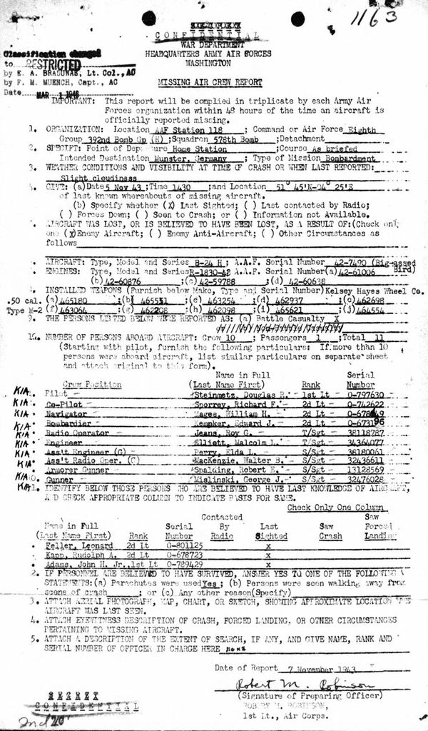 The ship was seen about 5,000 feet below the formation, in trouble. One observer reports the plane being followed down by enemy aircraft and stated that B-24 was in flames. In all, 4 chutes were seen to open, drifting northward.