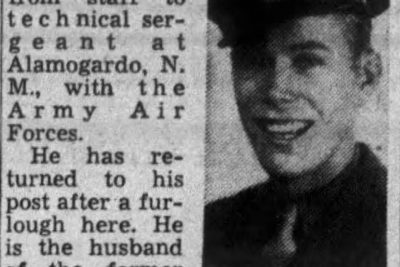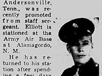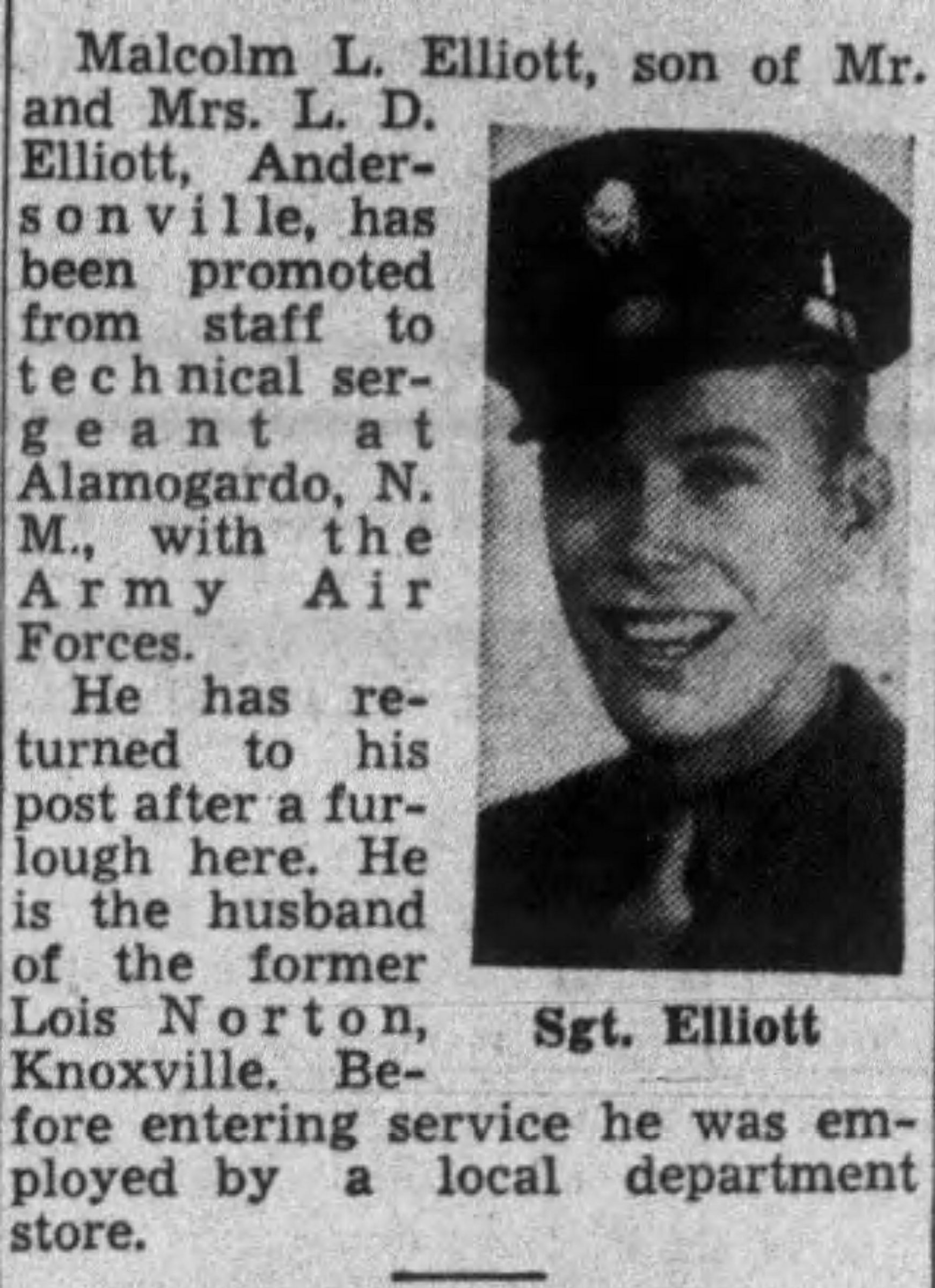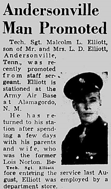 Tech. Sgt. Malcolm L. Elliott, son of Mr. and Mrs. L.D. Elliott, Andersonville, Tenn., was recently promoted from staff sergeant. Elliott is stationed at the Army Air Base at Alamagordo, N.M. He has returned to his station after spending a few days with his parents and wife, who was the former Louis Norton. Before entering the service last August, Elliott was employed by a department store.