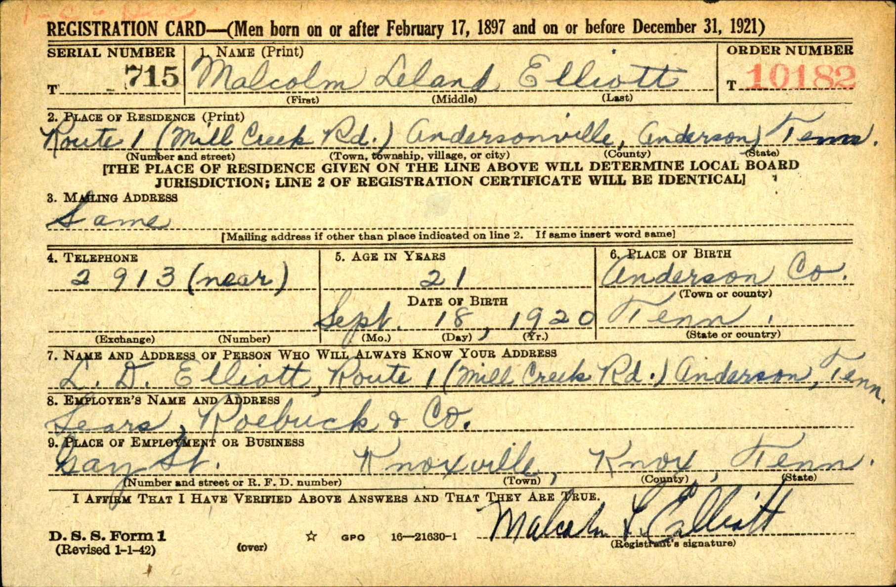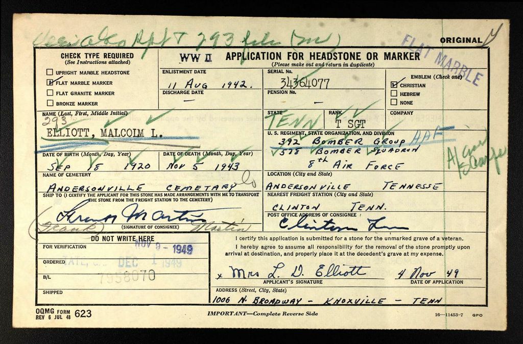 Technical Sergeant Malcolm Leland Elliott was the son of Leland Dewey Utley Elliott and Della Jane Piles Elliott. He had two sisters, Winifred Madolyn Elliott and Virginia S. Elliott. He was married and worked as a salesperson. He enlisted in the military on August 12, 1942 in Fort Oglethorpe, Georgia. He was killed in action on November 5, 1943. He is buried in Andersonville Cemetery, Clinton, TN.