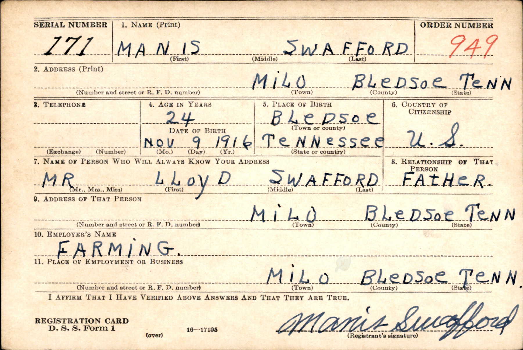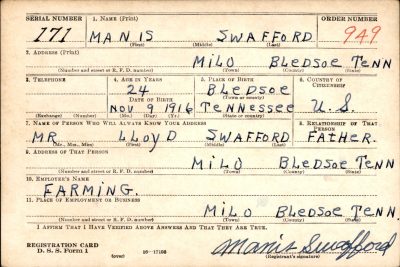 Manis Swafford was the son of Loyd William Swafford and Media A Thurman. Husband of Ella Mae Knight.