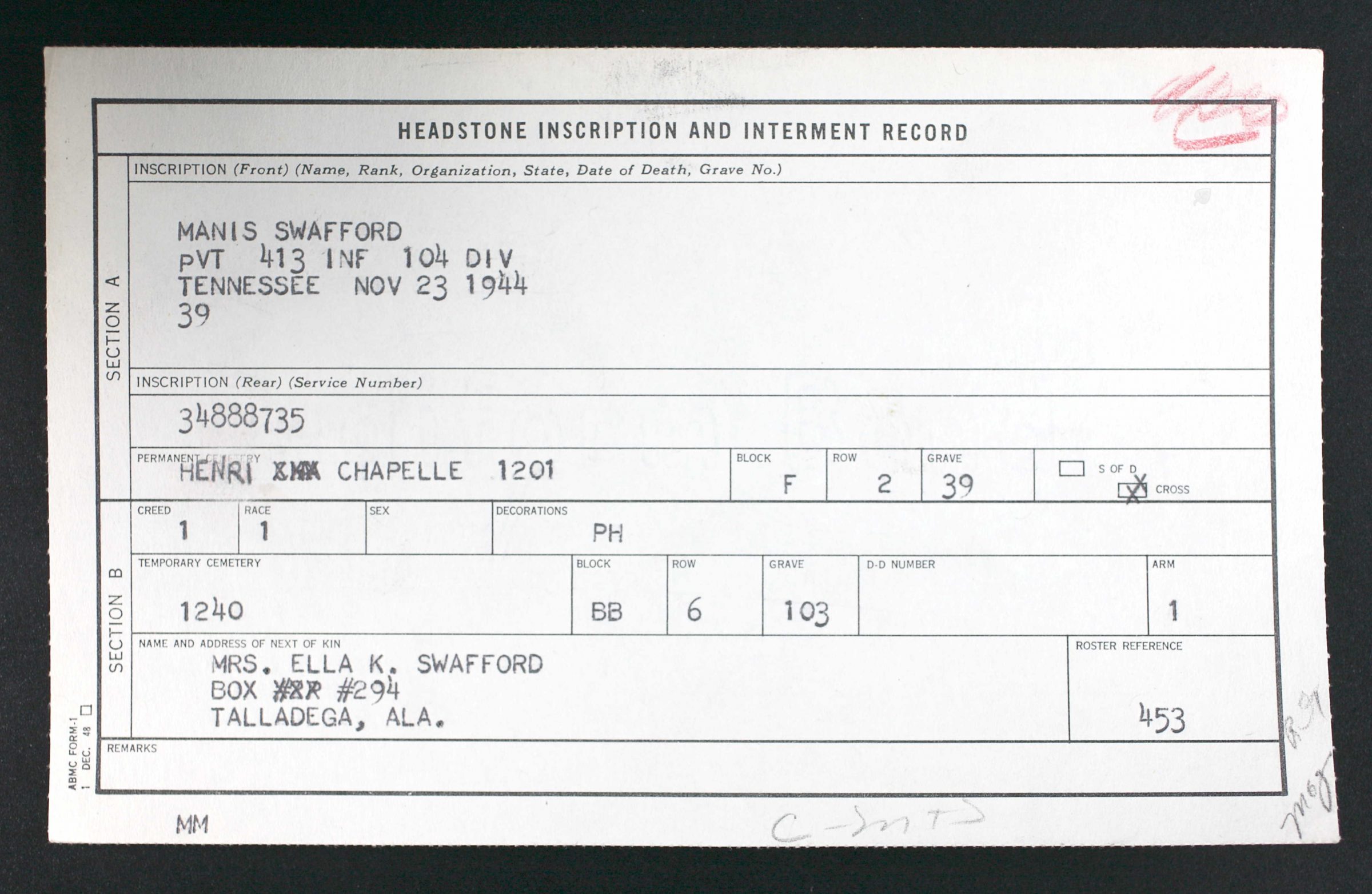 - Burial/Memorial Location: Henri-Chapelle American Cemetery, Henri-Chapelle, Belgium