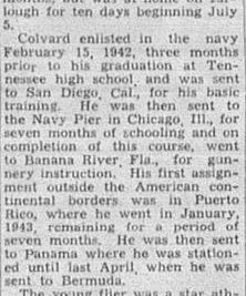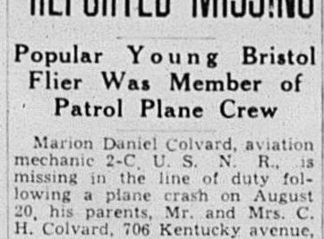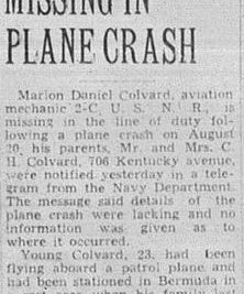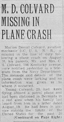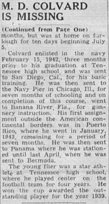 Marion Daniel Colvard, aviation mechanic 2-C, U.S.N.R., is missing in the line of duty following a plane crash on August 20, his parents, Mr. and Mrs. C.H. Colvard, 706 Kentucky avenue, were notified Wednesday in a telegram from the Navy Department. The message said details of the plane crash were lacking and no information was given as to where it occurred. Young Colvard, 23, had been flying aboard a patrol plane and had been stationed in Bermuda in a rest area when his family last heard from him in a letter dated August 19. He had been in service outside the limits of the United States for the past 20 months, but was at home on furlough for ten days beginning July 5. Colvard enlisted in the navy February 15, 1942, three months prior to his graduation at Tennessee high school, and was sent to San Diego, Cal., for his basic training. He was then sent to the Navy Pier in Chicago, Ill., for seven months of schooling and on completion of this course, went to Banana River, Fla., for gunnery instructions. His first assignment outside the American continental borders was in Puerto Rico, where he went in January, 1943, remaining for a period of seven months. He was then sent to Panama where he then sent to Panama where he was stationed until last April, when he was sent to Bermuda. The young flier was a star athlete at Tennessee high school, where he played center on the football team for four years. He won the cup awarded the outstanding player for the year in 1939.