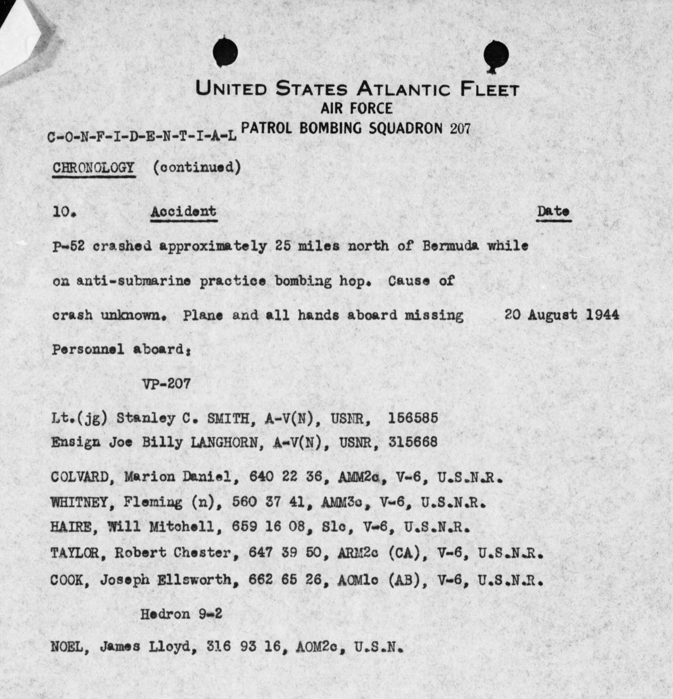 Marion D. Colvard was aboard a P-52 which crashed approximately 25 North of Bermuda while on anti-submarine practice bombing hop. Cause of the crash is unknow. Plane and all hands aboard are missing.