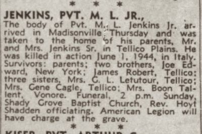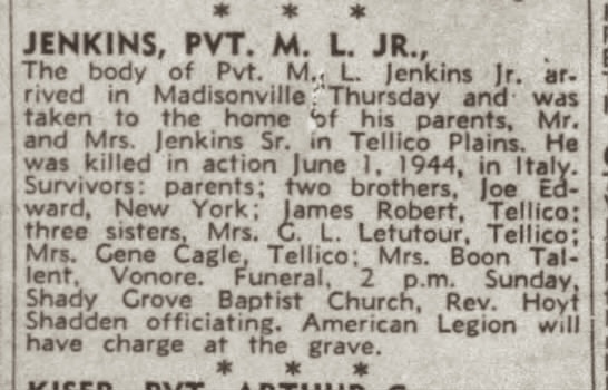 Reburied at Shady Grove Cem., Monroe Co., Tn, August 15, 1948. Son of Mark L. and Nettie Jenkins also buried at Shady Grove Cem.