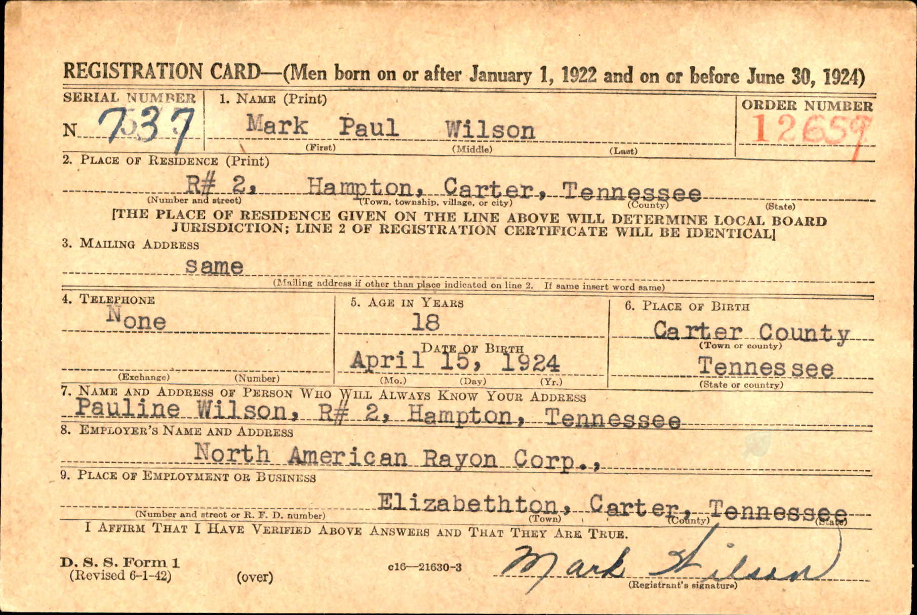 Mark Paul Wilson was born in Carter County, Tennessee to Ray Scott Wilson and Mae Pierce.