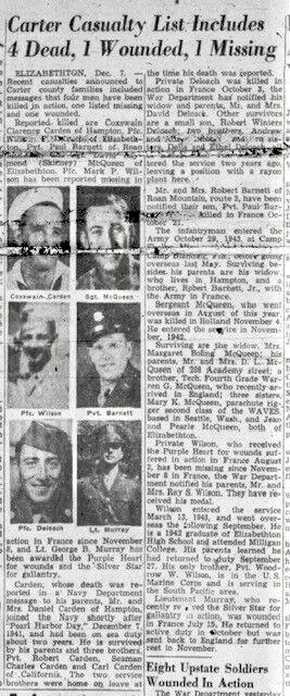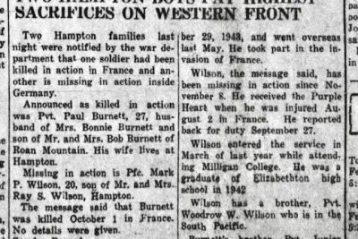 Wilson is one of several Tennessee soldiers killed in the Hürtgen area whose remains have been identified by DPAA. Pvt. Warren G.H. DeVault of Rhea, killed during the Battle of Hürtgen Forest, was accounted for on Sept. 14, 2020. Army Pfc. William F. Delaney of Kingston was accounted for on Dec. 17, 2018. Army Pfc. Lewis E. Price of Rogersville was identified in Sept. 2018. All four men are believed to have died in Nov. 1944.