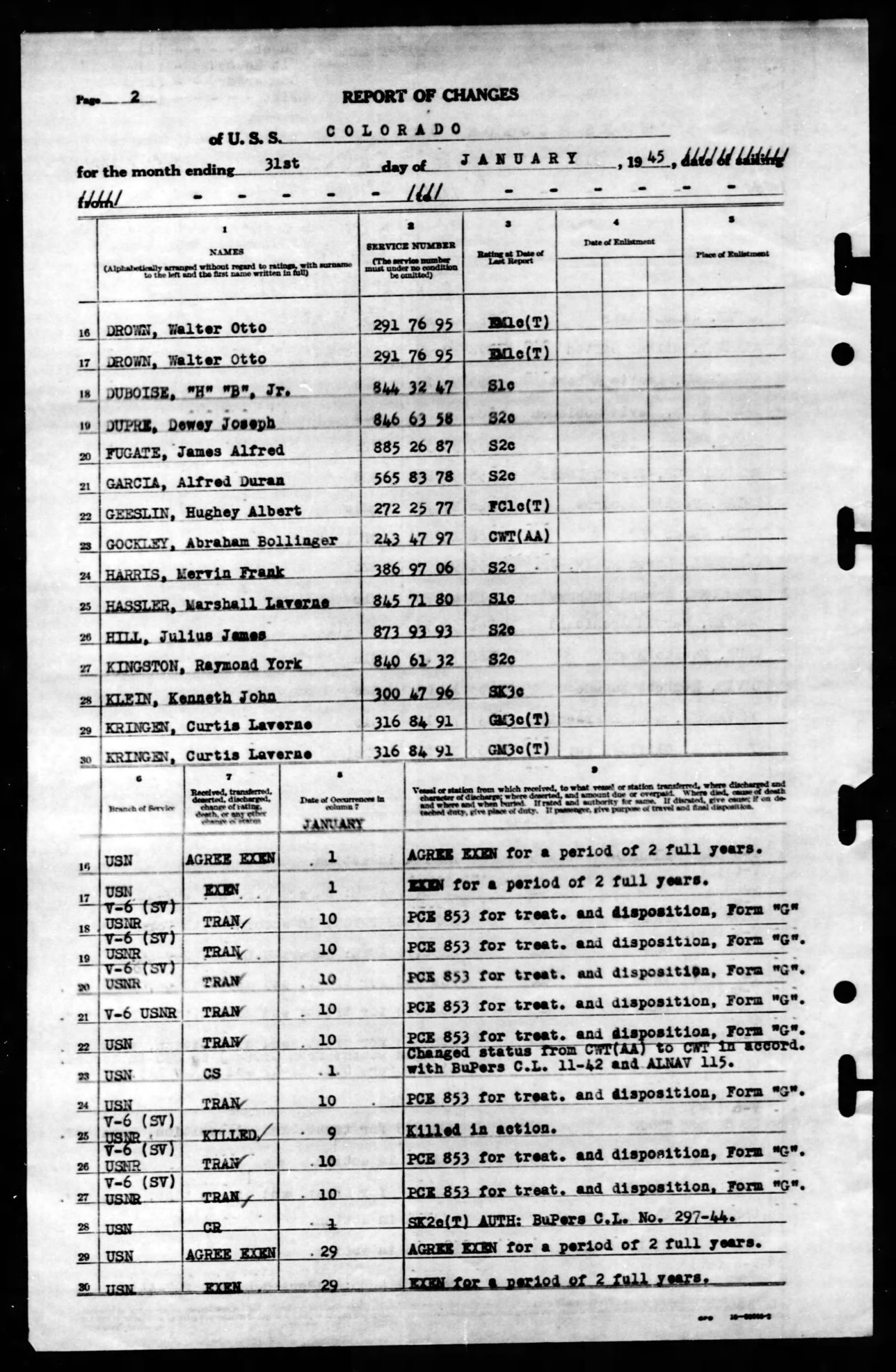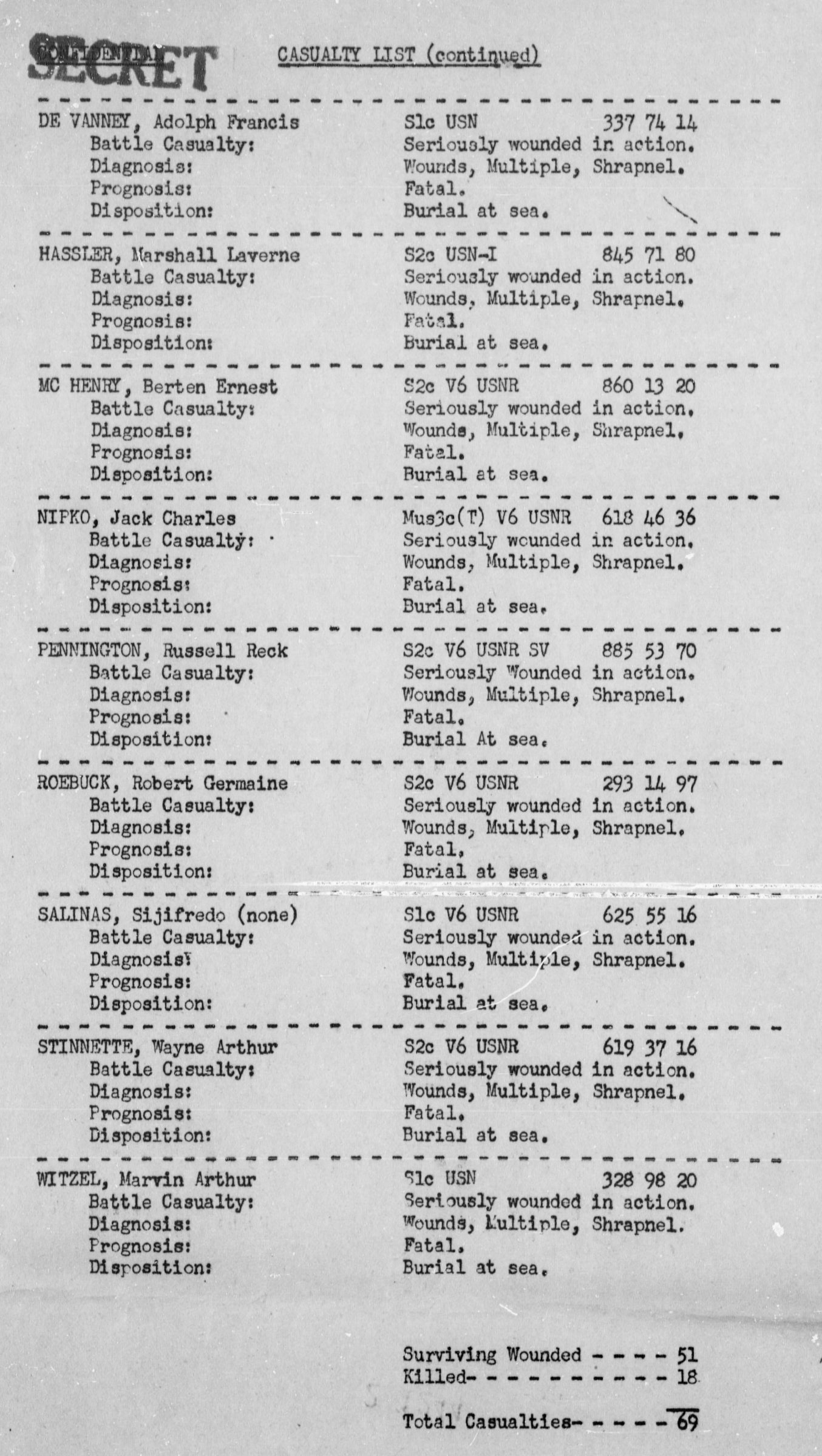 He was killed in action on January 9, 1945 when the USS Colorado BB-45 was struck by a defective anti-aircraft shell. The Colorado was supporting the landings in Lingayen Gulf, Philippines. He was fatally wounded and buried at sea. He is memorialized at Manila American Cemetery.