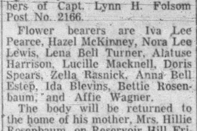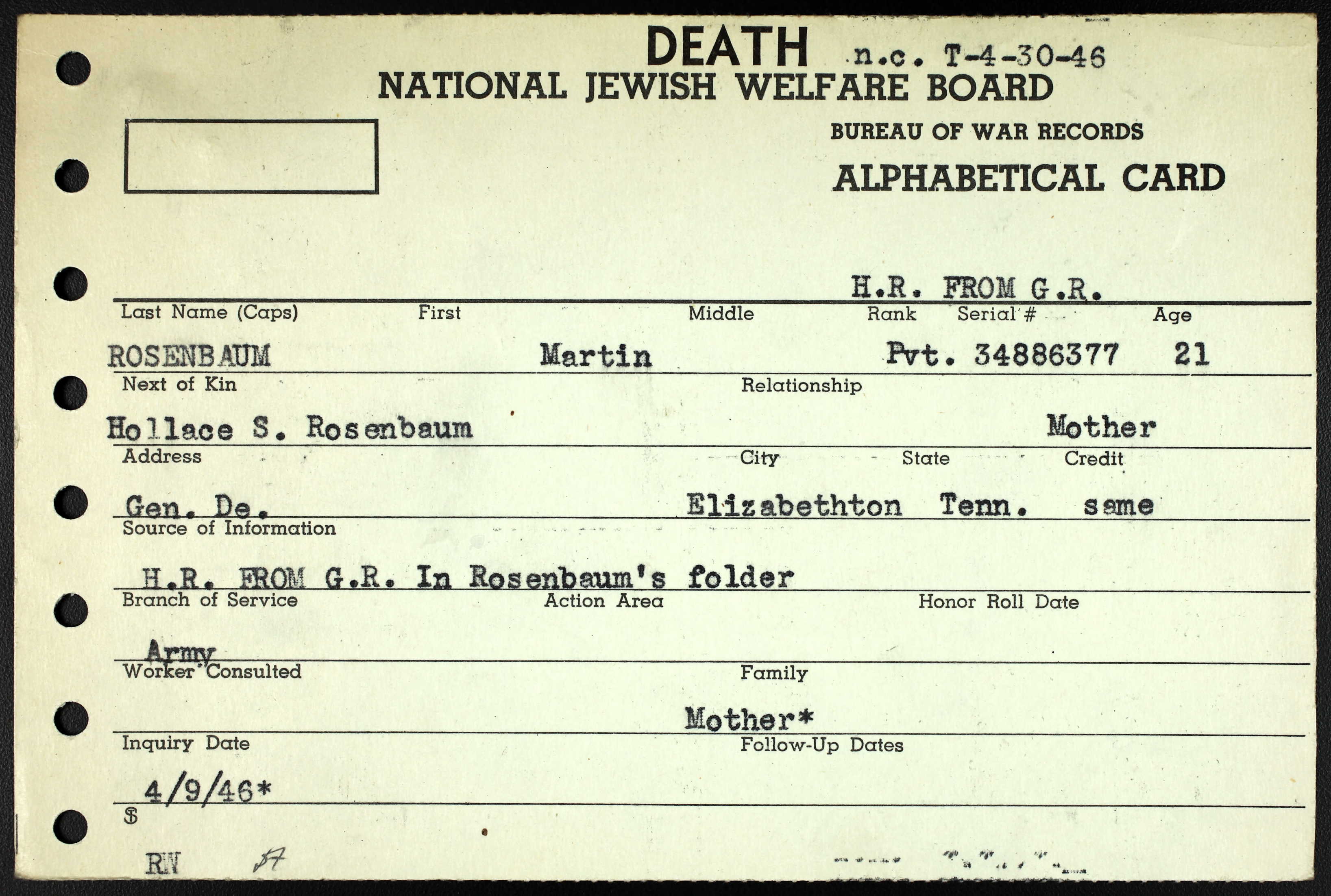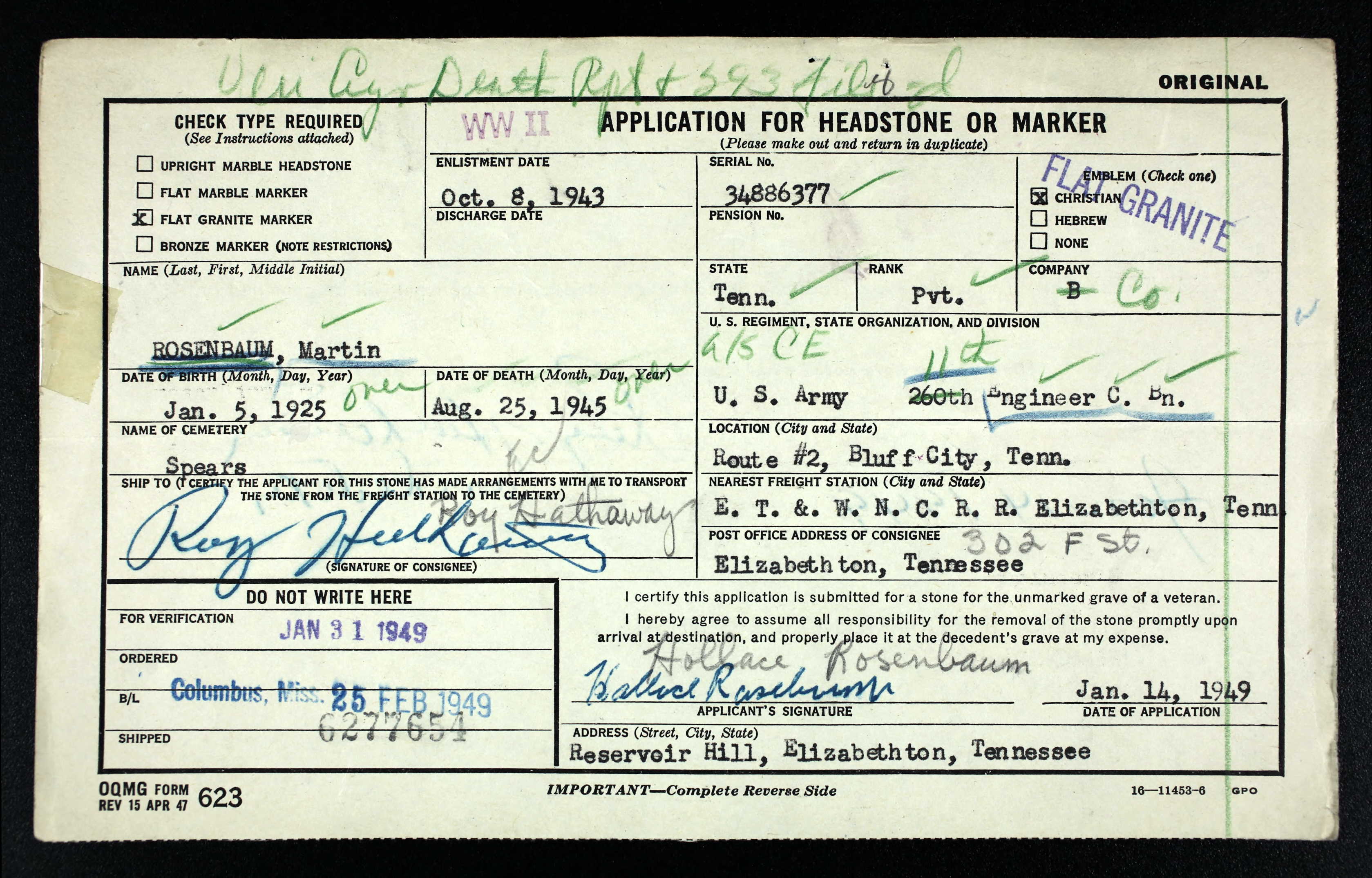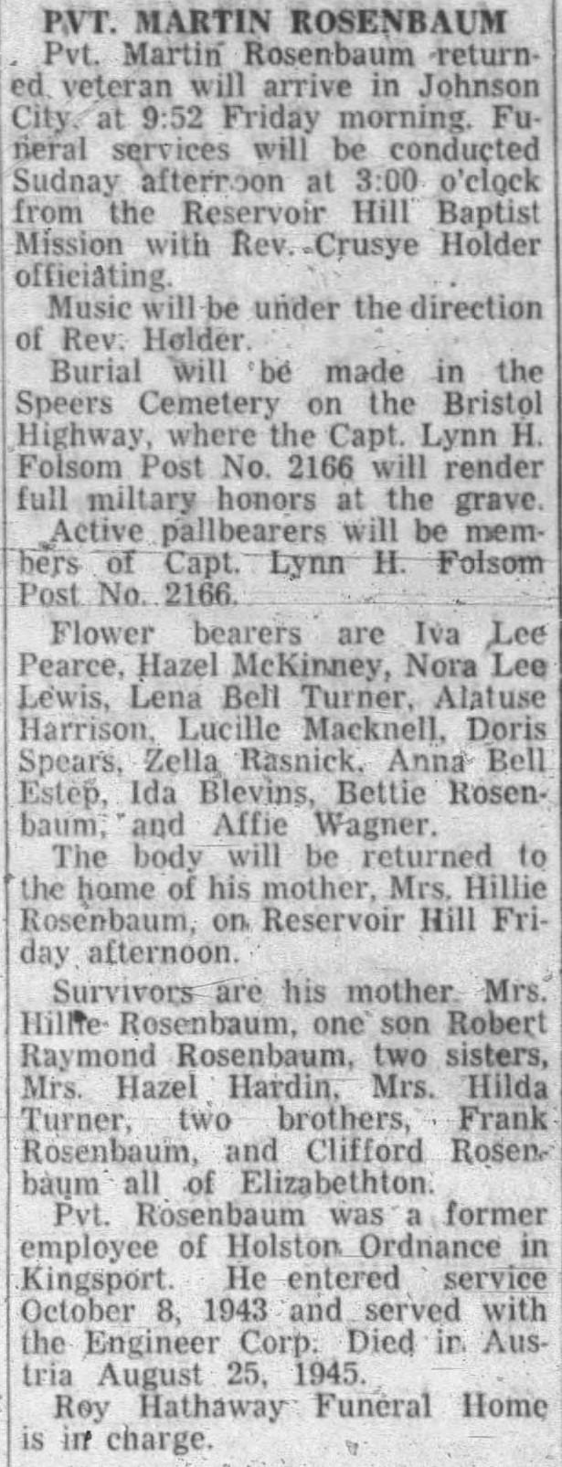 Pvt. Martin Rosenbaum returned veteran will arrive in Johnson City. Funeral services will be conducted from the Reservoir Hill Baptist Mission with Rev. Crusye Holder officiating. Burial will be made in the Speers Cemetery on the Bristol Highway, where the Capt. Lynn H. Folsom Post No. 2166 will render full military honors at the grave. The body will be returned to the home of his mother, Mrs. Hillie Rosenbaum, on Reservoir Hill. Survivors are his mother, Mrs. Hillie Rosenbaum, one son Robert Raymond Rosenbaum, two sisters, Mrs. Hazel Hardin, Mrs. Hilda Turner, two brothers, Frank Rosenbaum and Clifford Rosenbaum, all of Elizabethton. Pvt. Rosenbaum was a former employee of Holston Ordnance in Kingsport. He entered service October 8, 1943 and served with the Engineer Corp. Died in Austria August 25, 1945.
