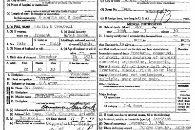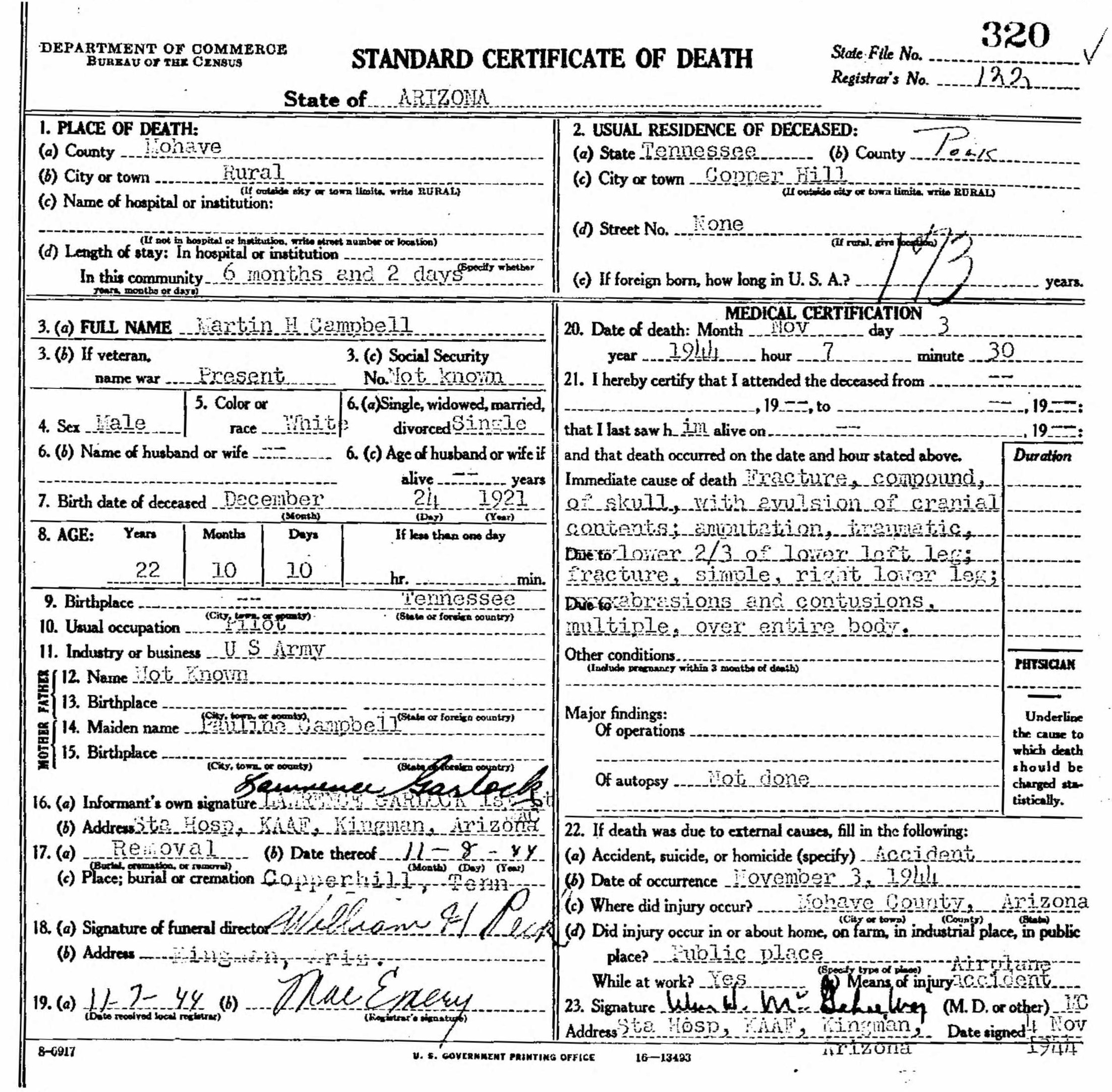 Martin Hoyt Campbell Jr. perished when the U.S. Army Air Corps P-39Q Airacobra, with serial number 44-2378, he was piloting collided with a B-17G Flying Fortress with serial number 42-31296 at Kingman, Arizona. The bomber left Kingman Airport on a gunnery training mission jointly with a USAF Bell P-39Q Airacobra registered 44-2378. While flying at an altitude of 12,000 feet, the pilot of the Bell misjudged the distance between both aircraft, causing the Bell to hit the left wing of the Flying Fortress. At least 15 feet of the left wing was sheared off. Out of control, both aircraft dove into the ground and crashed in a desert area located near Kingman Airport. All 15 occupants on both aircraft were killed.