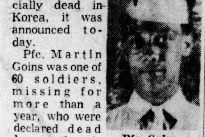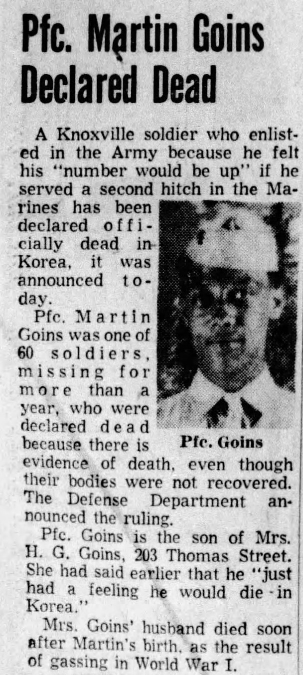 A Knoxville soldier who enlisted in the Army because he felt his “number would be up” if he served a second hitch in the Marines has been declared officially dead in Korea, it was announced today. Pfc. Martin Goins was one of 60 soldiers, missing for more than a year, who were declared dead because there is evidence of death, even though their bodies were not recovered. The Defense Department announced the ruling. Pfc. Goins is the son of Mrs. H.G. Goins, 203 Thomas Street. She had said earlier that he “just had a feeling he would die in Korea.” Mrs. Goins’ husband died soon after Martin’s birth, as the result of gassing in World War I.