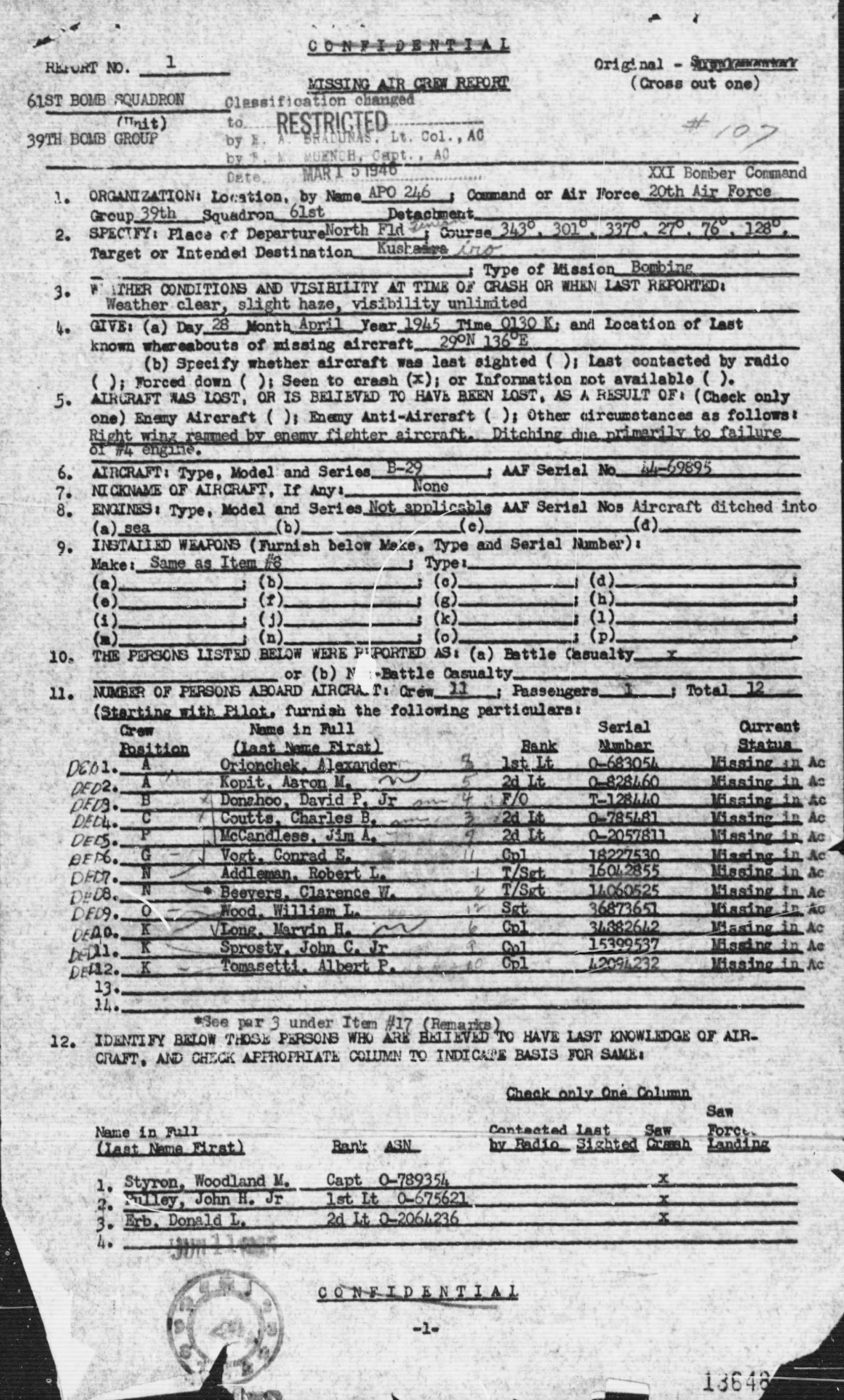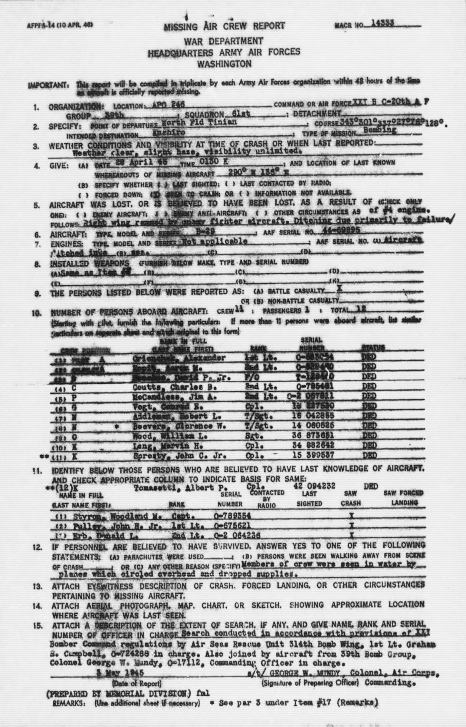Aircraft B-29 with serialnumber 44-69895 departed from North Field at Tinian on a bombing mission to Kushiro. The right wing of the plane was seen to have been rammed by enemy fighter aircraft over the target, however, it is believed ditching was due primarily to failure of #4 engine. Survivors were observed in the water after ditching by planes circling overhead. Supplies were dropped and position noted. When rescue units arrived on scene no survivors were found. Marvin Long is memorialized at Honolulu.
