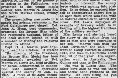 Pvt. Marvin N. Lewis, artilleryman with an attached unit in the 43rd Infantry (Winged Victory) Division, has been awarded the Bronze Star, posthumously, for heroic action while in combat against the Japanese on Luzon. He was the son of Mrs. Sally S. Lewis of 508 Market street. During a surprise Jap attack on Pvt. Lewis’ battery, Pvt. Lewis with others moved from his foxhole to intercept the enemy force which was moving into position. In so doing he exposed himself to concentrated enemy fire in an open field which was flat with no natural obstacles to afford any cover. Pvt. Lewis held tenaciously to his position until killed by enemy fire.