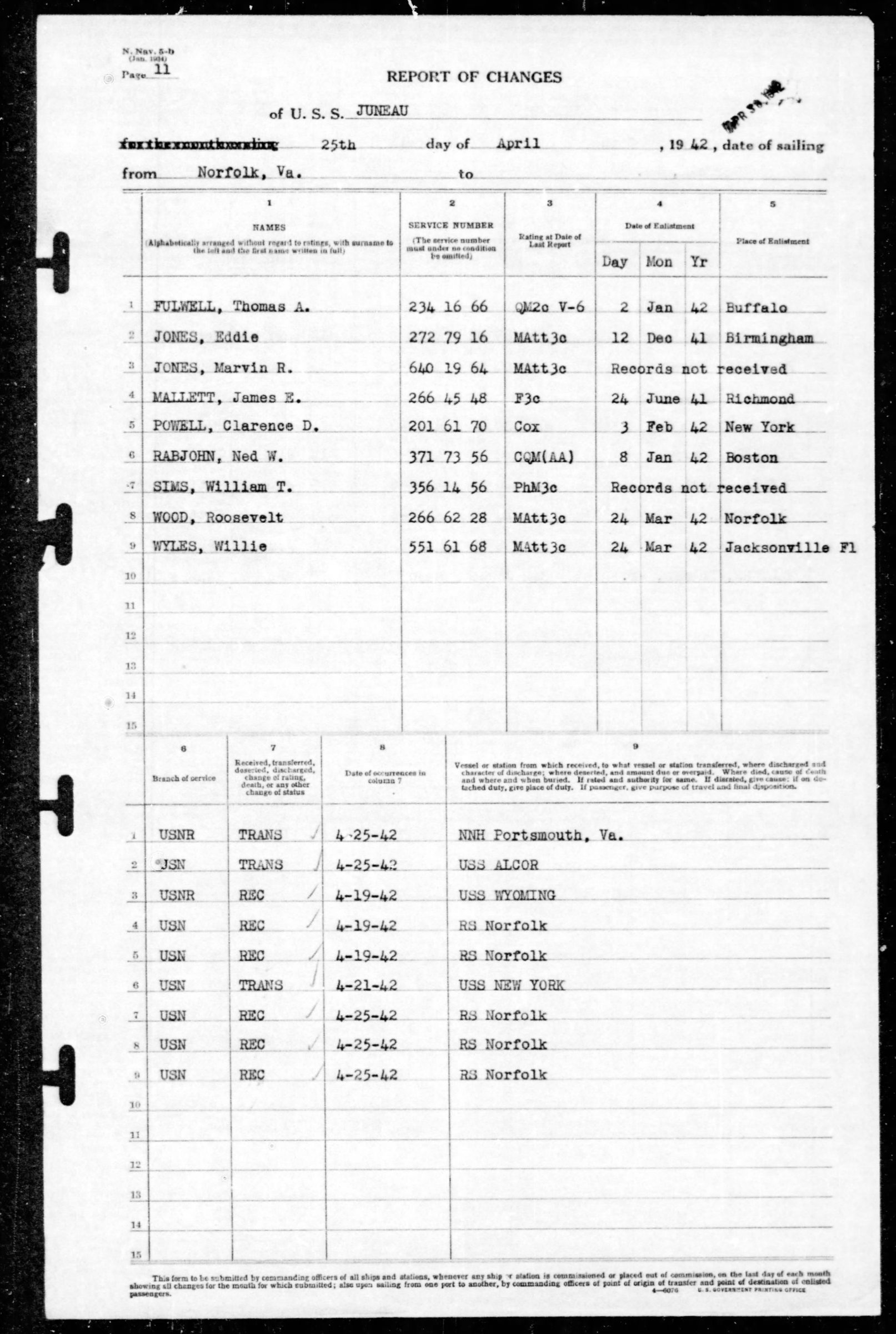 Shipped aboard the USS Juneau CL-52. On the night of 12-13 November 1942, Juneau was part of a task force that set out to stop a Japanese fleet headed for Guadalcanal to bombard the Marines. During the battle Juneau and USS Atlanta were credited with sinking two destroyers. During the action Juneau was struck by a torpedo and forced to retire from the action. With only one propeller functioning Juneau proceeded to safety through Sealark Channel, along with the damaged cruiser USS San Francisco CA-38 Cruiser Helena and 2 destroyers.
