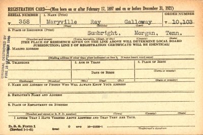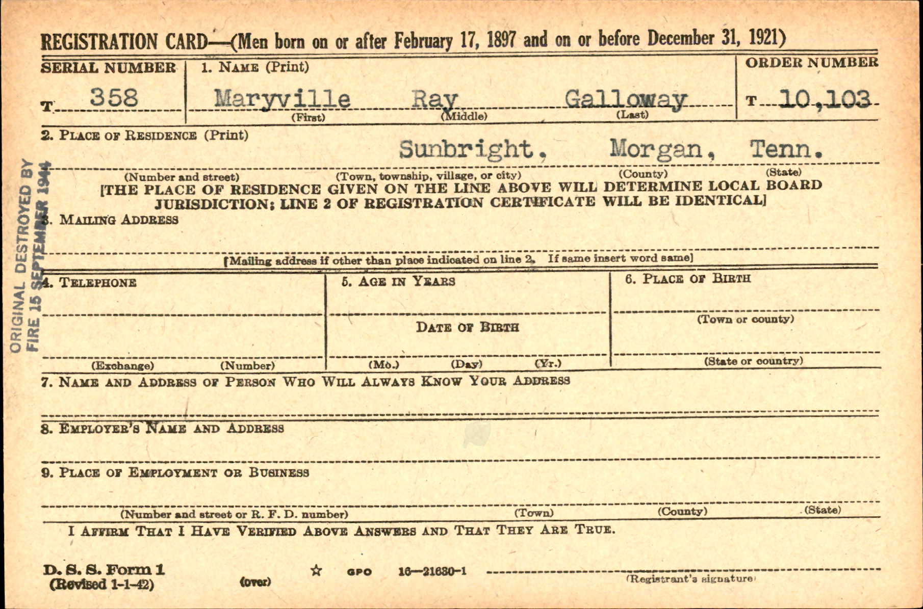 Maryville Ray Galloway was born 16 January 1921. He was the son of Francis Marion Galloway and Mary Jane Innis.