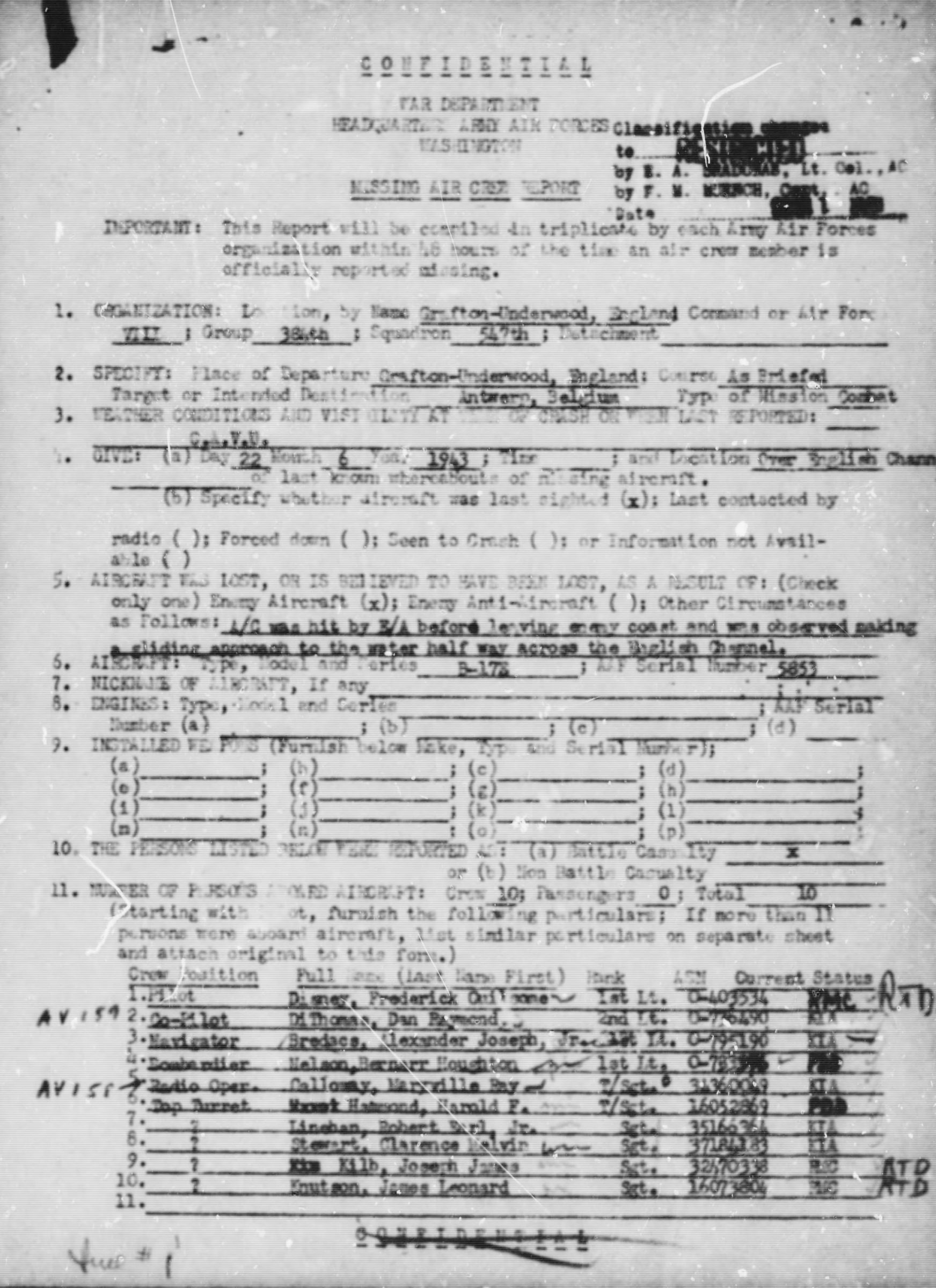 On 22 June 1943, Aircraft B-17E with serial number 42-5853 departed from Grafton-Underwood, England on a combat mission to Antwerp, Belgium. The aircraft was hit by Enemy Aircraft leaving the enemy coast and was observed making a gliding approach to the water half way across the English Channel. According to Sgt James L. Knutson, one of the three survivors, T-Sgt Galloway made an effort to get out of the ship but was unable to move about due to the centrifugal force. He was probably killed when the ship hit the water.