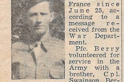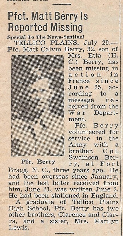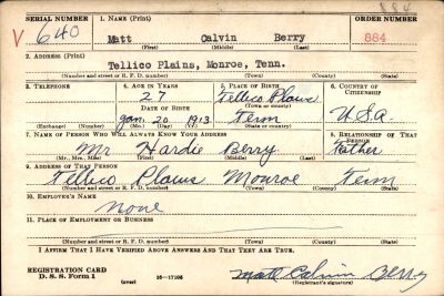Matt Calvin Berry was born in Tellico Plains, the son of Hardie Berry and Etta Turpin. Private First Class Berry enlisted in the US Army on April 26, 1941 at Fort Oglethorpe, Georgia.