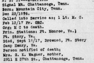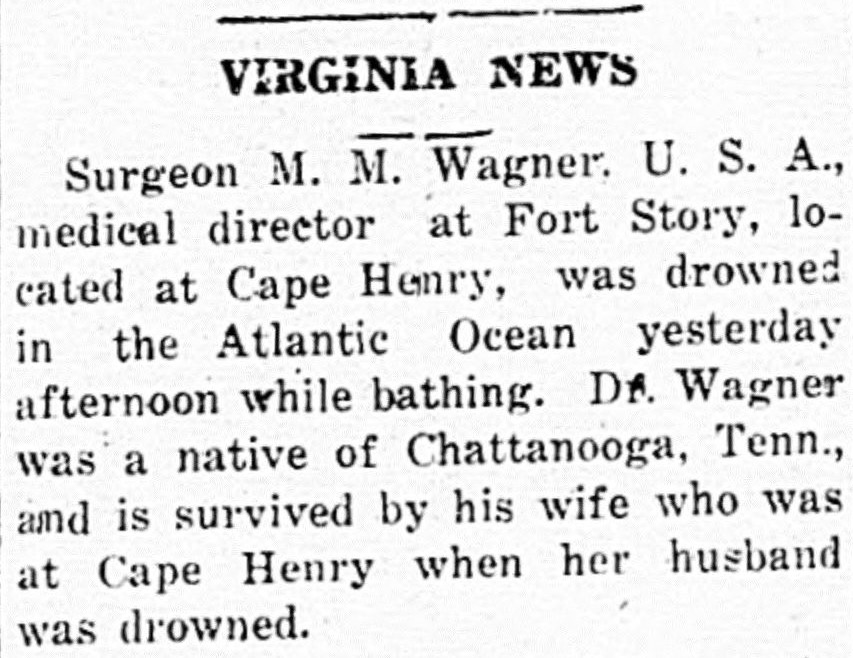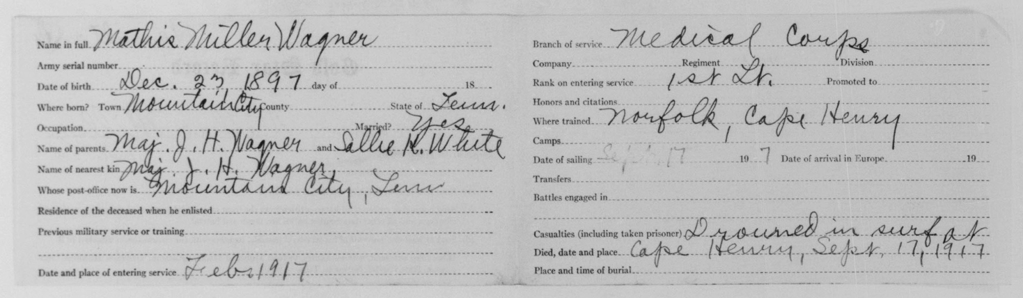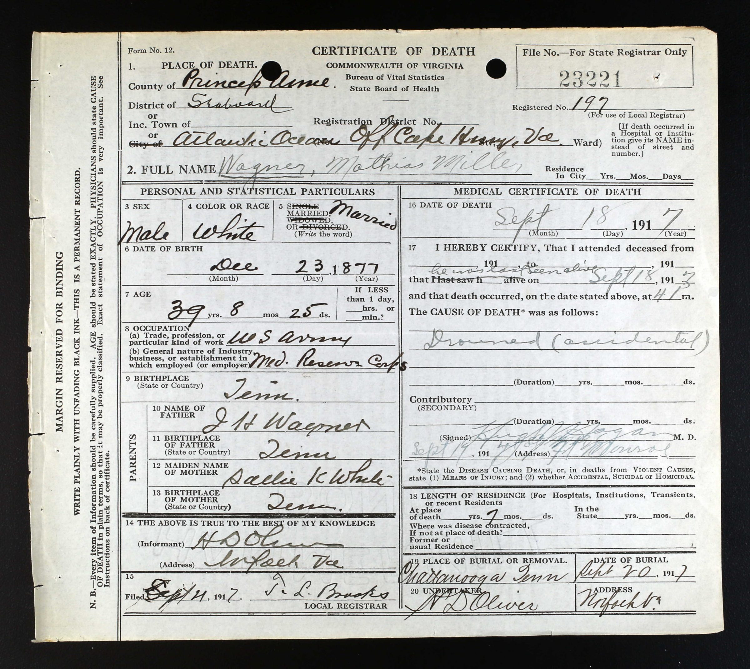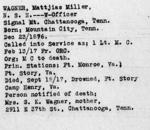 Lieutenant Wagner drowned at Cape Henry, Virginia. He attended Mountain City High School and Medical School at the University of Tennessee Center of Health Sciences and Tennessee College of Medicine in Memphis.