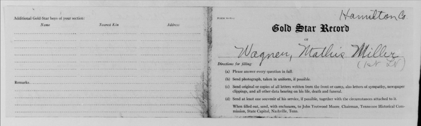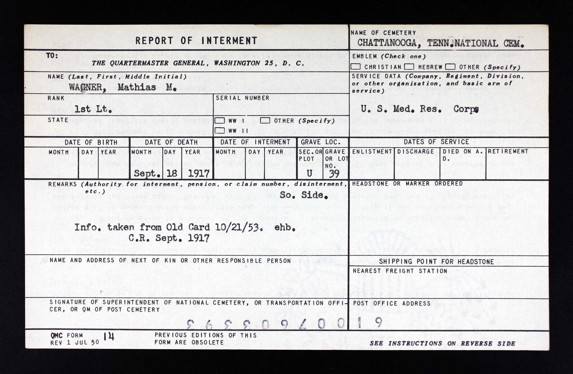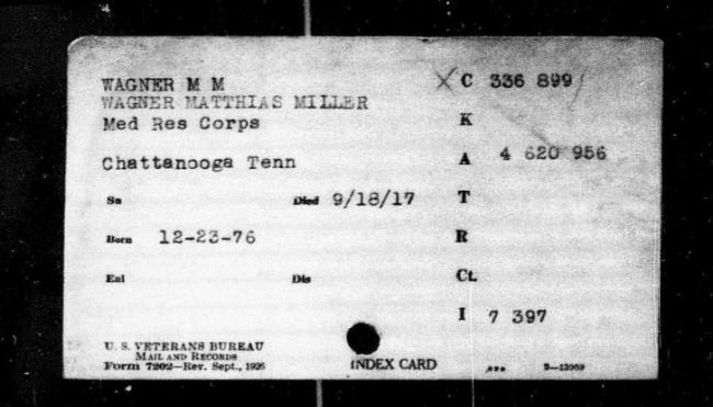 Matthias ( also Mathias or Mathis) Miller Wagner was born 23 December 1877 in Taylorsville, Johnson County, Tenn. His parents were Joseph Hugh Wagner and Sarah Sallie Kussuth White. He married Belle Milburn in 1901. He served in the U.S. Army as a 1st Lt. and died 18 Sept 1917. He is buried in Chattanooga National Cemetery, 1200 Bailey Avenue, Chattanooga, TN. Grave location, Section U – Site 39.