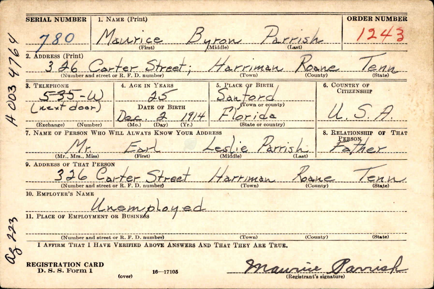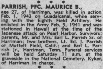 Maurice Parrish was born in Sanford, Florida, the son of Earl Leslie Parrish and Juanita Pearl Hannah. He was killed in action on Guadalcanal while serving with the Eighth Field Artillery. He enlisted in the army Feb. 5, 1941 and was stationed in Hawaii at the time of the Japanese attack on Pearl Harbor.