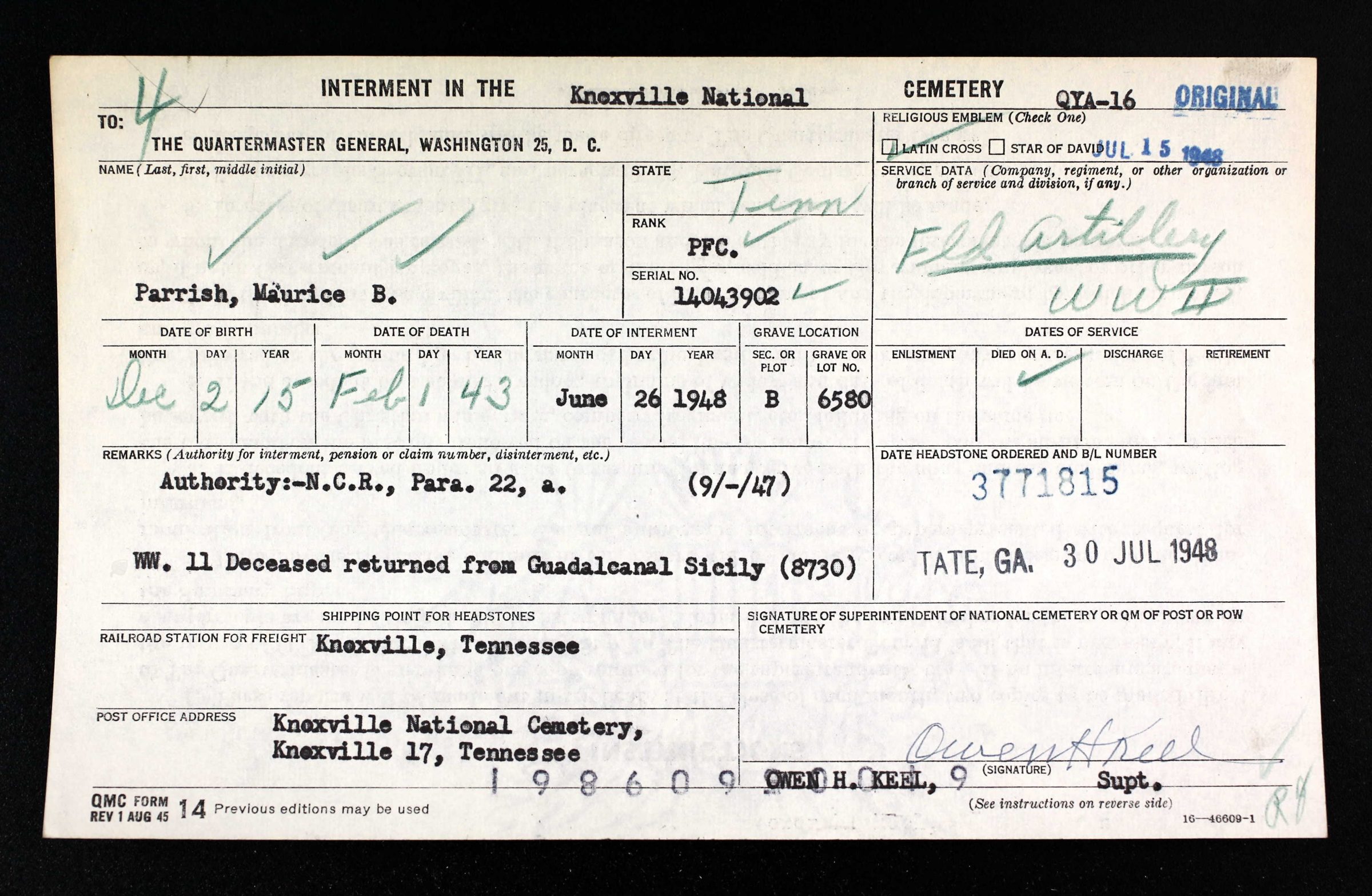 - Burial/Memorial Location: Knoxville National Cemetery, Knoxville, Knox County, TN