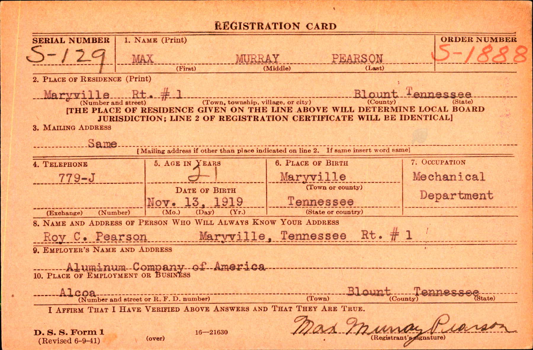 Max Murray Pearson was born in Maryville, Blount County, TN to Roy Chelsey Pearson and Mamie E. Feezell.