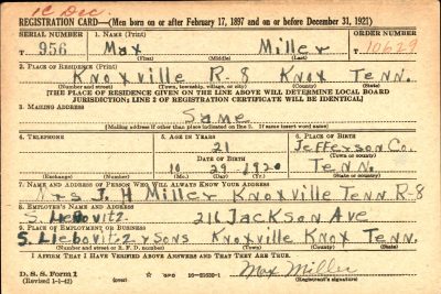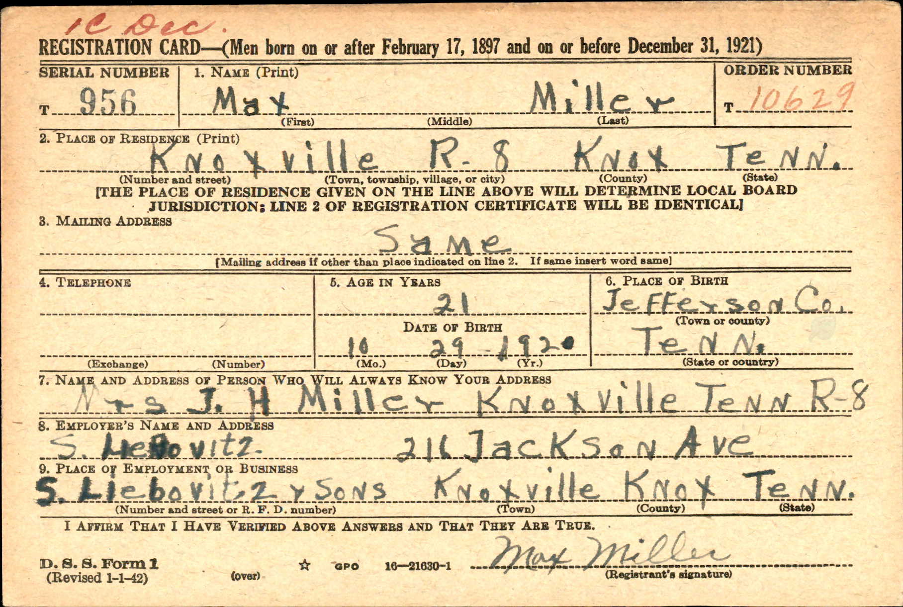 Staff Sgt. Max E. Miller, 22, former shirt factory employee here, and son of Mrs. Maude Miller, widow, of Riverdale and New Market, was one of a bomber crew of nine found dead last night in the wreckage of their plane near Ephrata, Wash, Army Air Base. The mother, who recently moved from Riverdale to New Market was officially notified today, and United Press carried an account of the accident. Only other immediate family member is a brother, Emile Miller, who lives with his mother. The dispatch said the wreckage of the four-engined bomber and the bodies were recovered after a five-day search. “His mother was earlier notified that the plane was 24 hours overdue,” Mrs. Rush Miller, Riverdale, aunt of the victim, said today. “Only the other day Max wrote his mother and enclosed his wings and diploma ( he had just graduated as staff sergeant at Las Vegas, Nev., gunnery school. “He said the service had changed his way of life. He was attending church service regularly and had taken out heavy insurance for his mother and brother. “Max wrote her that he and his crew expected to go overseas and into action in their bomber and that he might not get back.” Wilbur H. Blair, a superintendent at the Knoxville plant where young Miller worked, said today: “He was a fine boy. I’ve corresponded with him all along. After gunnery school graduation he wrote that he was ‘on top of the world.’ ”