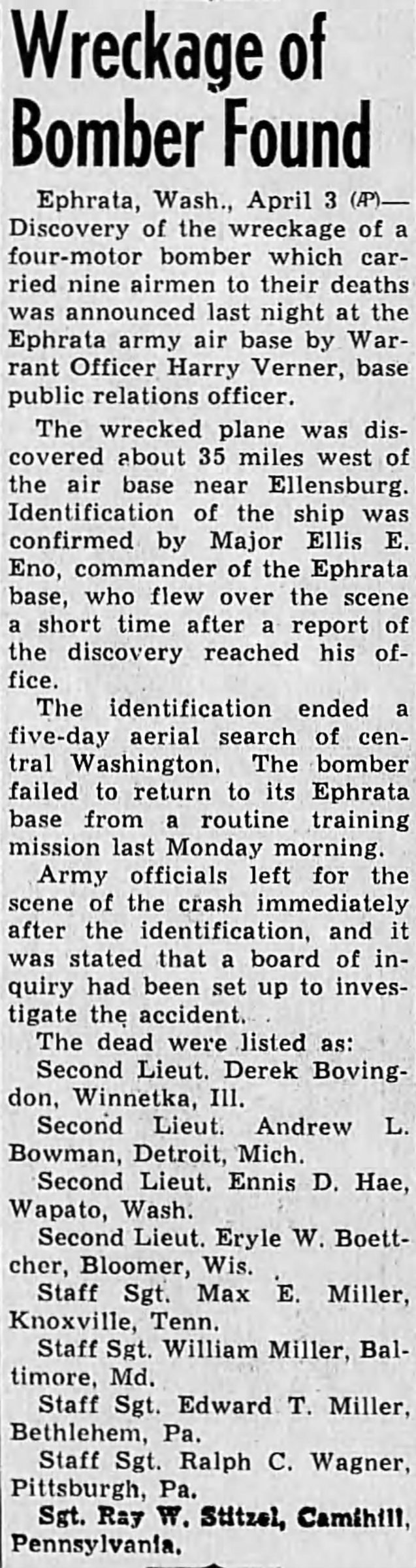 One of nine Airmen killed when the bomber struck a mountaintop, 16 miles east of Ellensburg, WA, while operating from the Ephrata Army Air Base.