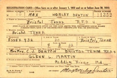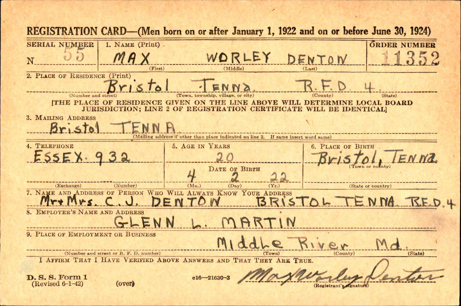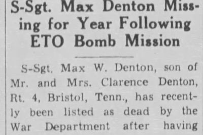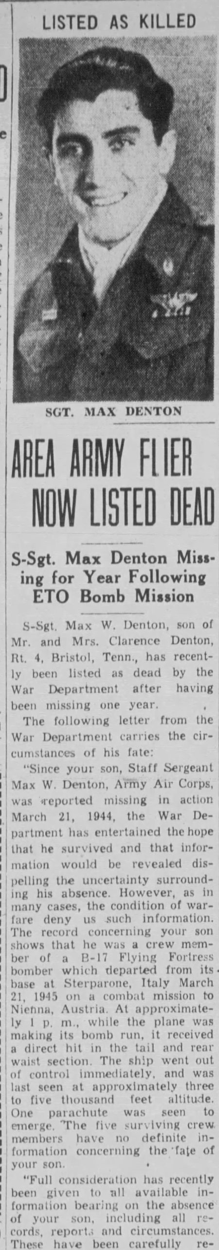 S-Sgt. Max W. Denton, son of Mr. and Mrs. Clarence Denton, Rt. 4, Bristol, Ten., has recently been listed as dead by the War Department after having been missing one year. The following letter from the War Department carries the circumstances of his fate: