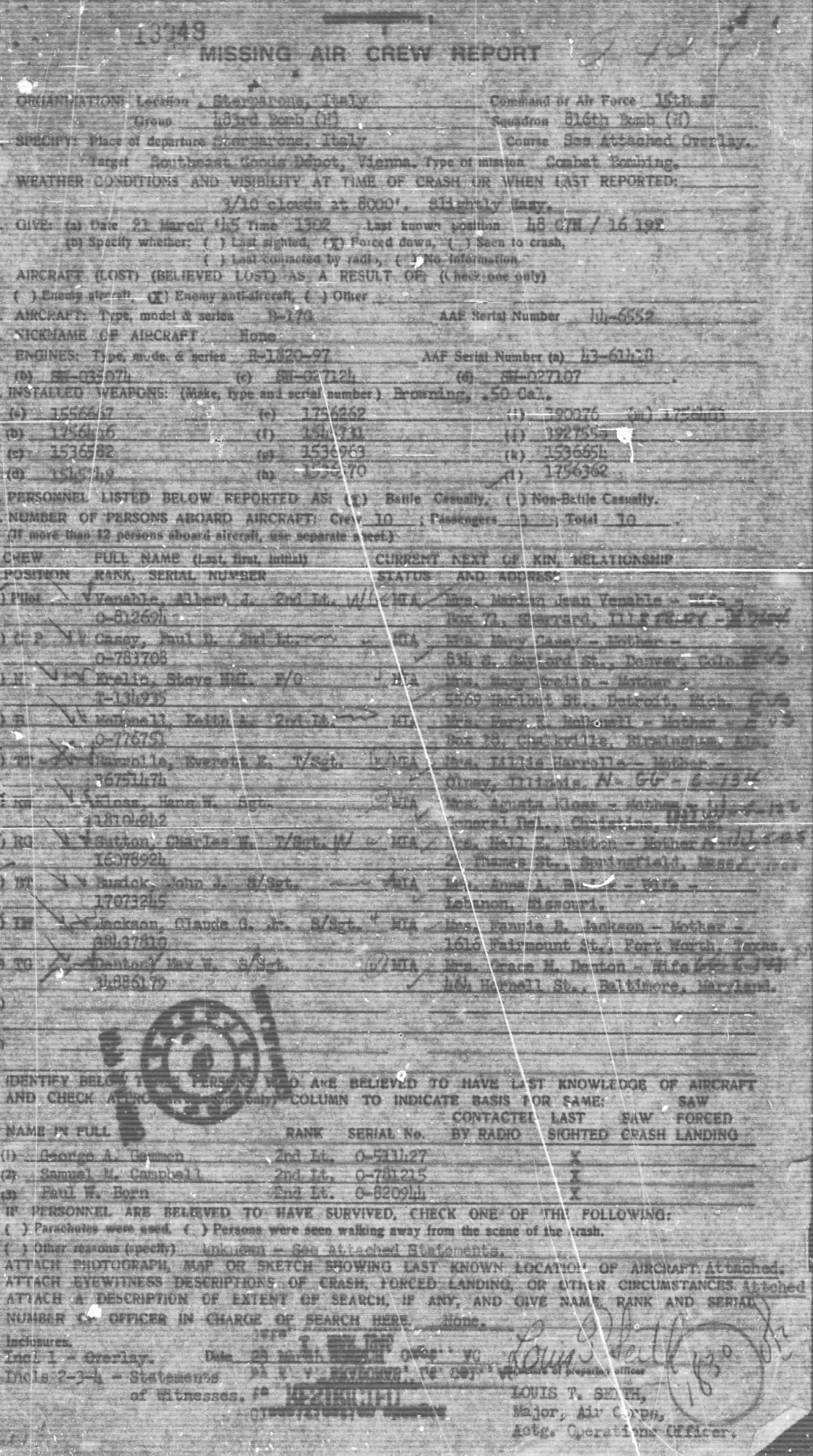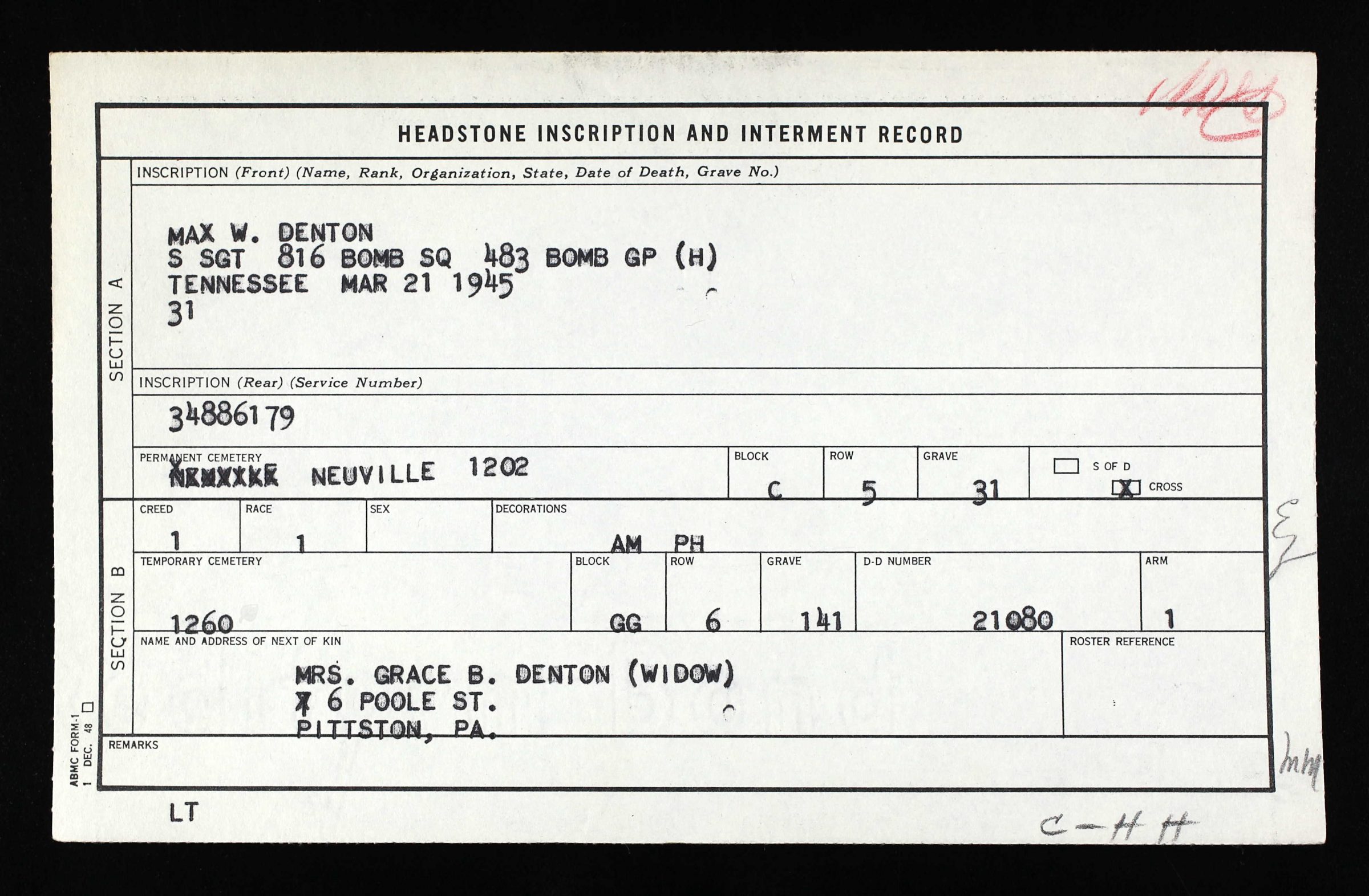 “Since your son, Staff Sergeant Max W. Denton, Army Air Corps, was reported missing in action March 21, 1944, the War Department has entertained the hope that he survived and that information would be revealed dispelling the uncertainty surrounding his absence. However, as in many cases, the condition of warfare deny us such information. The record concerning your son shows that he was a crew member of a B-17 Flying Fortress bomber which departed from its base at Sterparone, Italy March 21, 1945 on a combat mission to Nienna, Austria. At approximately 1 p.m., while the plane was making its bomb run, it received a direct hit in the tail and rear waist section. The ship went out of control immediately, and was last seen at approximately three to five thousand feet altitude. One parachute was seen to emerge. The five surviving crew members have no definite information concerning the fate of your son. Full consideration has recently been given to all available information bearing on the absence of your son, including all records, reports and circumstances. These have been carefully reviewed and considered. In view of the fact that twelve months have not expired without the receipt of evidence to support a continued presumption of survival, the War Department must terminate such absence by a presumptive finding of death. Accordingly an official finding of death has been recorded. The finding does not establish an actual or probable date of death; however as required by law, it includes a presumptive date of death for the terminations of pay and allowances, settlements of accounts and payment of death gratuities. In the case of your son this date has been set as March 22, 1946, the day following the expiration of twelve months absence. I regret the necessity for this message but trust that the ending of a long period of uncertainty may give at least some small measure of consolation. I hope you may find sustaining comfort in the thought that the uncertainity with which war has surrounded the absence of your son has enhanced the honor of his service to his country and of his sacrifice.”