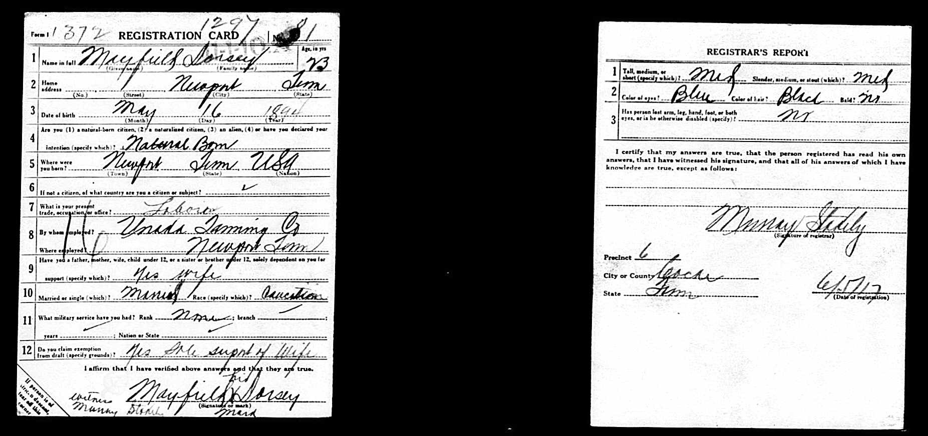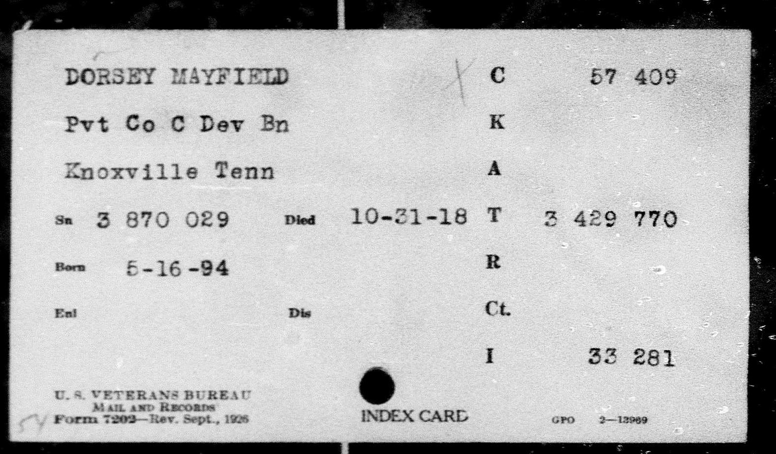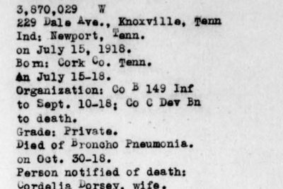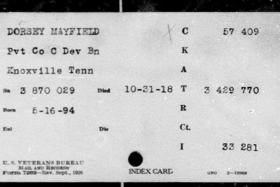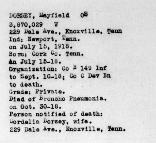 Mayfield Dorsey was the son of William Deadrick Dorsey and Mary Dorsey of Cocke County, Tennessee. He was married to Cordelia Dorsey. Pvt Dorsey died of broncho pneumonia.
