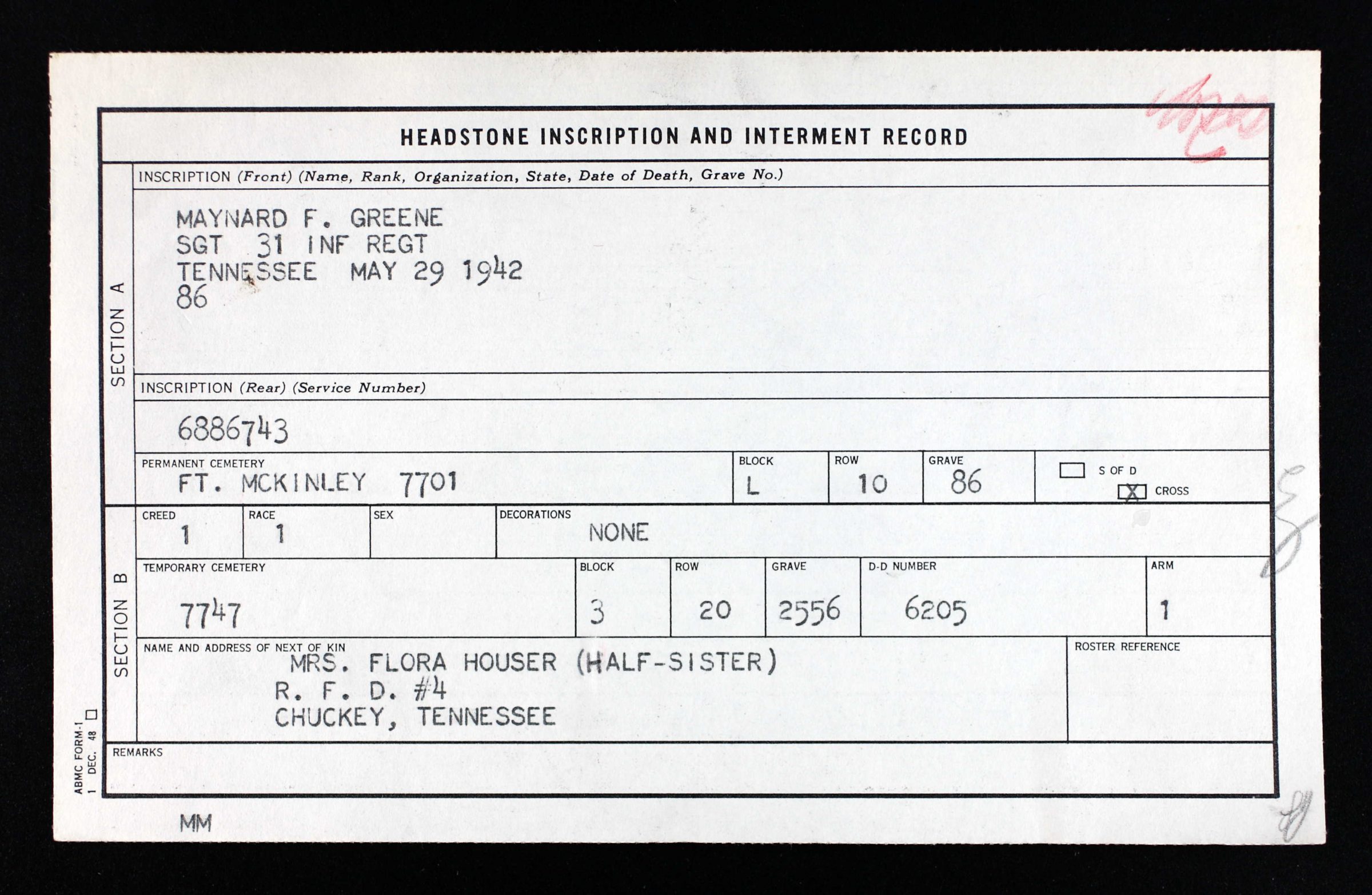 Sergeant Greene died on 29th of May 1942. He is interred at the Manila American Cemetery, L,10,86, Philippines.
